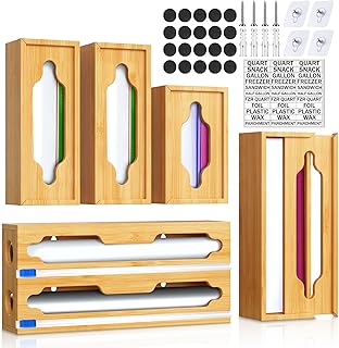 This 6-in-1 bag storage organizer features a versatile design for efficient kitchen organization. It includes compartments for foil, plastic wrap, and various sizes of sandwich and storage bags. The extended aluminum foil dispenser allows easy access and smooth tearing, while the bamboo baggie organizer fits neatly in drawers, keeping bags tidy and accessible. The product helps maximize space and maintain order in kitchen drawers, making it simple to find and store different types of bags and wraps. Its durable construction ensures long-lasting use, and the compact design fits conveniently in most kitchen setups. Ideal for organizing foil, plastic wrap, and assorted bag sizes, this organizer streamlines kitchen storage and enhances overall cleanliness. It is suitable for those seeking a practical solution to keep their kitchen essentials organized and within easy reach.