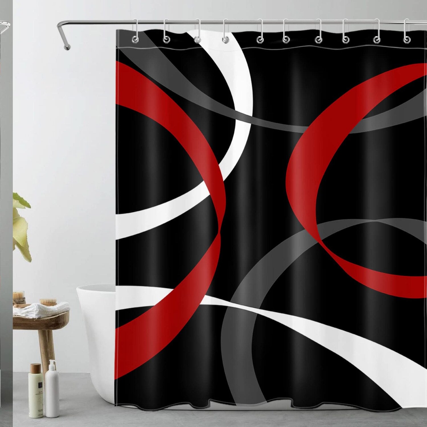 This abstract geometric shower curtain features a striking red, grey, and white striped design set against a black background, measuring 60 inches wide by 72 inches high. Made from waterproof polyester fabric, it dries quickly and does not require a liner. The curtain includes 10 holes for hooks, which are also provided, making installation simple. Its versatile design allows it to be used not only as a bathroom shower curtain but also as a door, kitchen, or window curtain, wall art decor, photo backdrop, tablecloth, or party decoration. The curtain effectively prevents water spray during showers, offers privacy, and adds a modern aesthetic to any space. It is neither too thin nor too thick, ensuring durability and functionality. The product is available in various themed designs suitable for holidays, children, tropical scenes, beach, sports, art, farmhouse, and more. It is a practical and stylish addition to any home, making it a thoughtful gift option.