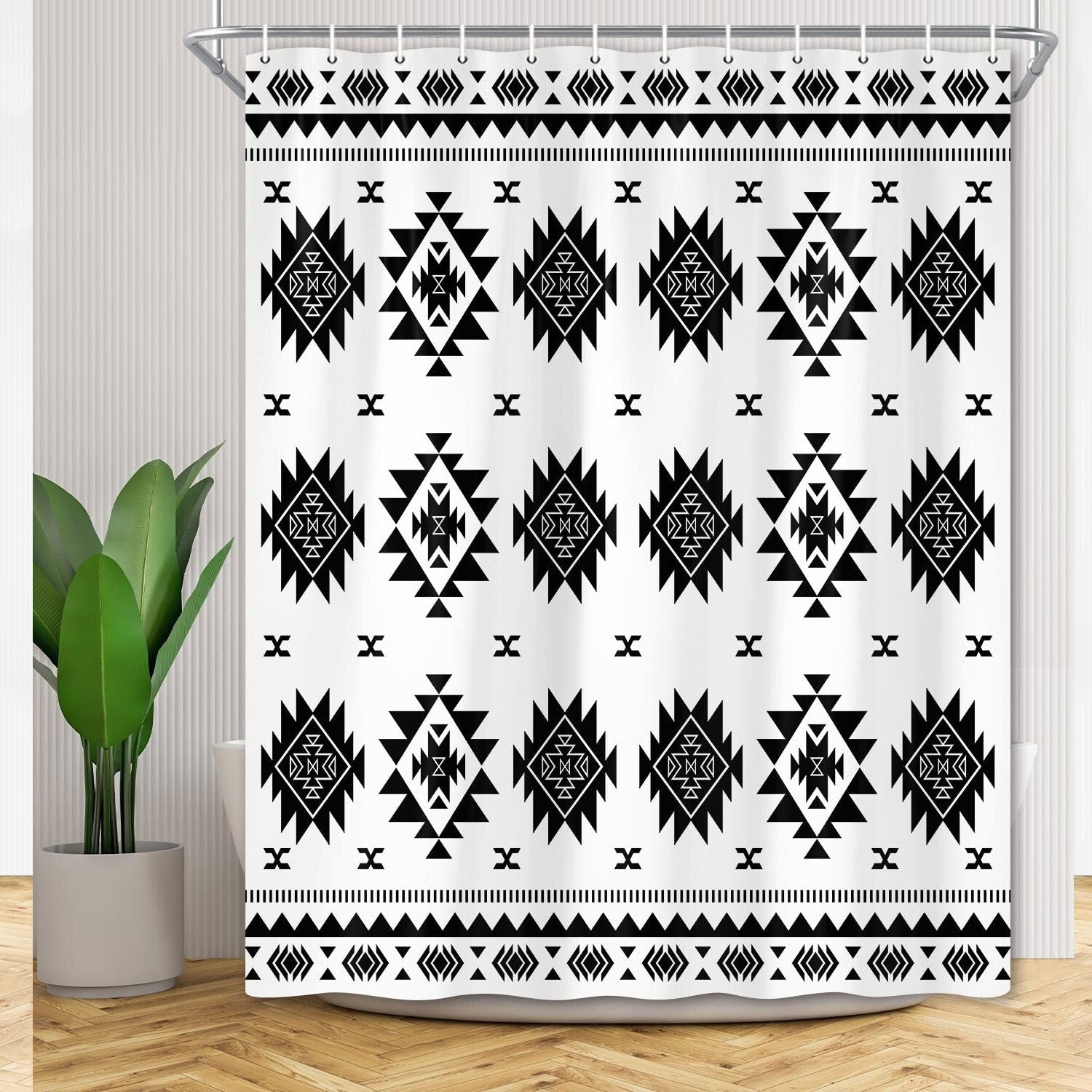 This black and white shower curtain features a striking Aztec tribal pattern, adding a bold and artistic touch to your bathroom decor. Designed with geometric and southwestern-inspired motifs, it creates a visually appealing focal point that elevates the overall aesthetic. The set includes hooks for easy installation and measures 72x72 inches, providing ample coverage for standard showers. Its versatile design complements various interior styles, from boho to western, making it suitable for homes, apartments, dorm rooms, condos, RVs, campers, gyms, and more. Crafted to bring a sense of sophistication and cultural charm, this shower curtain transforms your daily routine into a more luxurious experience. Whether updating your existing decor or creating a new look, this piece offers a stylish and functional addition to any bathroom space.