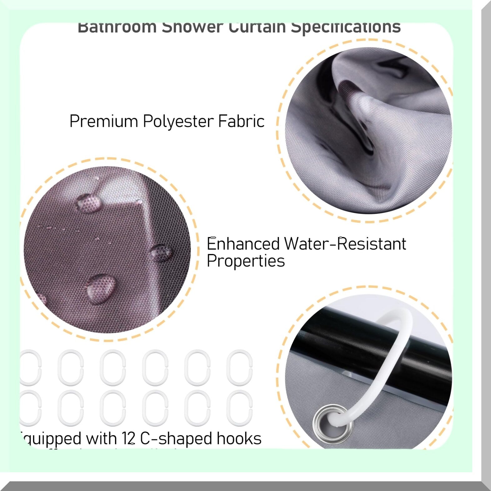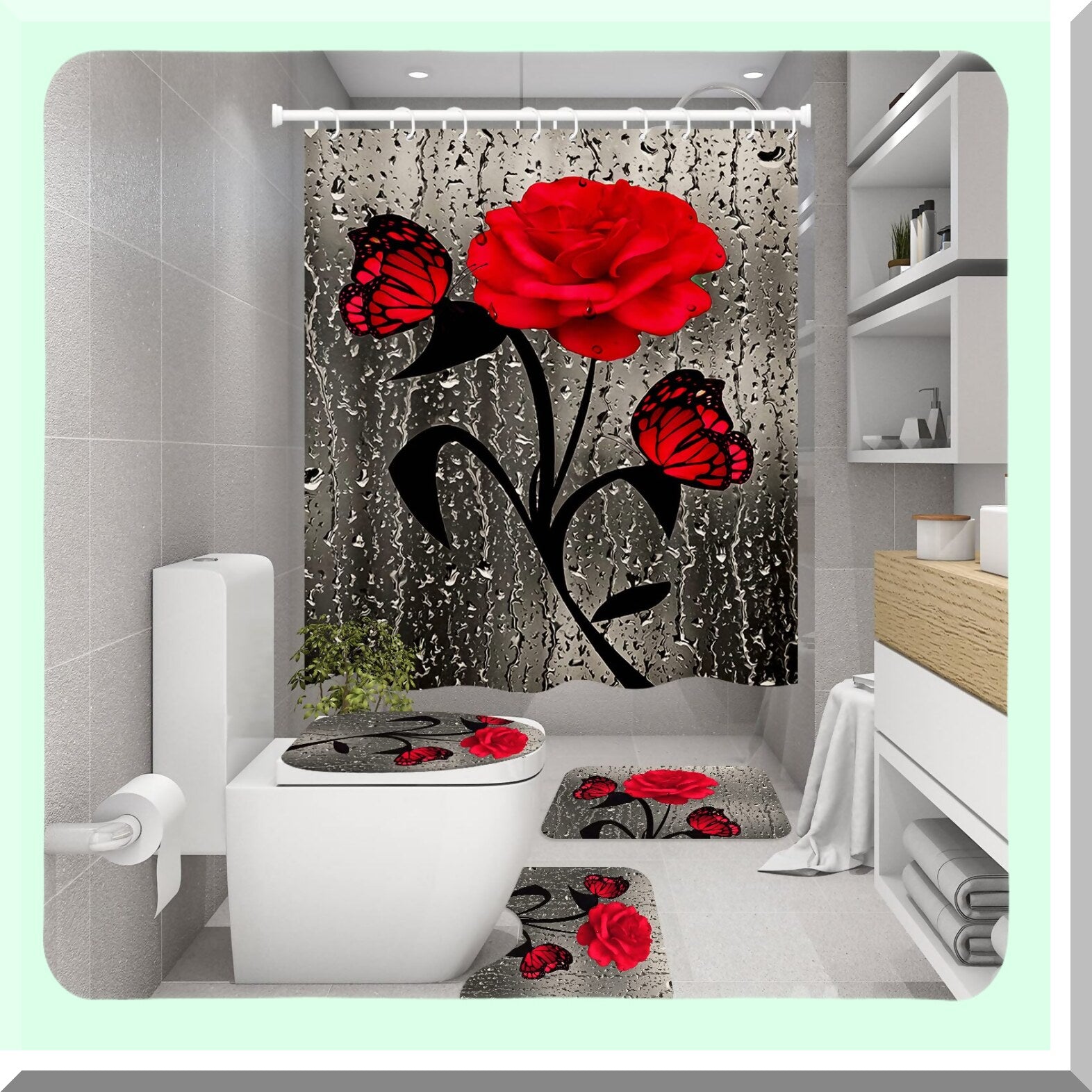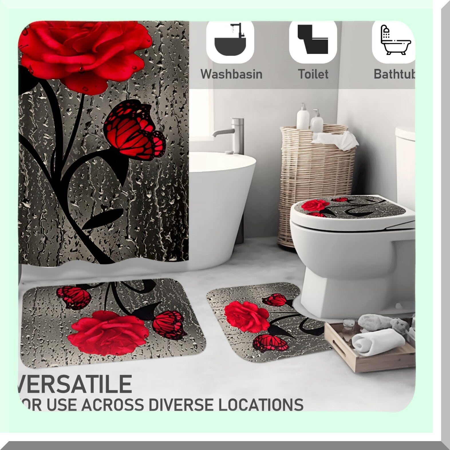 This 4-piece red rose shower curtain set includes a shower curtain, tet cover, U-shape tet rug, and bath mat, all featuring a floral and rose pattern. Made from water-resistant polyester, the set offers durability and easy maintenance, ideal for daily use. The shower curtain measures 72 x 84 inches, with a non-slip backing for safety. The bath mat is 20 x 31 inches, providing comfort and stability. The set also includes 12 sturdy hooks for convenient installation. Its elegant design adds a touch of sophistication to any bathroom, wall, or window. The materials are easy to clean and machine washable, making it suitable for busy households. This complete set offers a practical and stylish solution to refresh bathroom decor effortlessly.