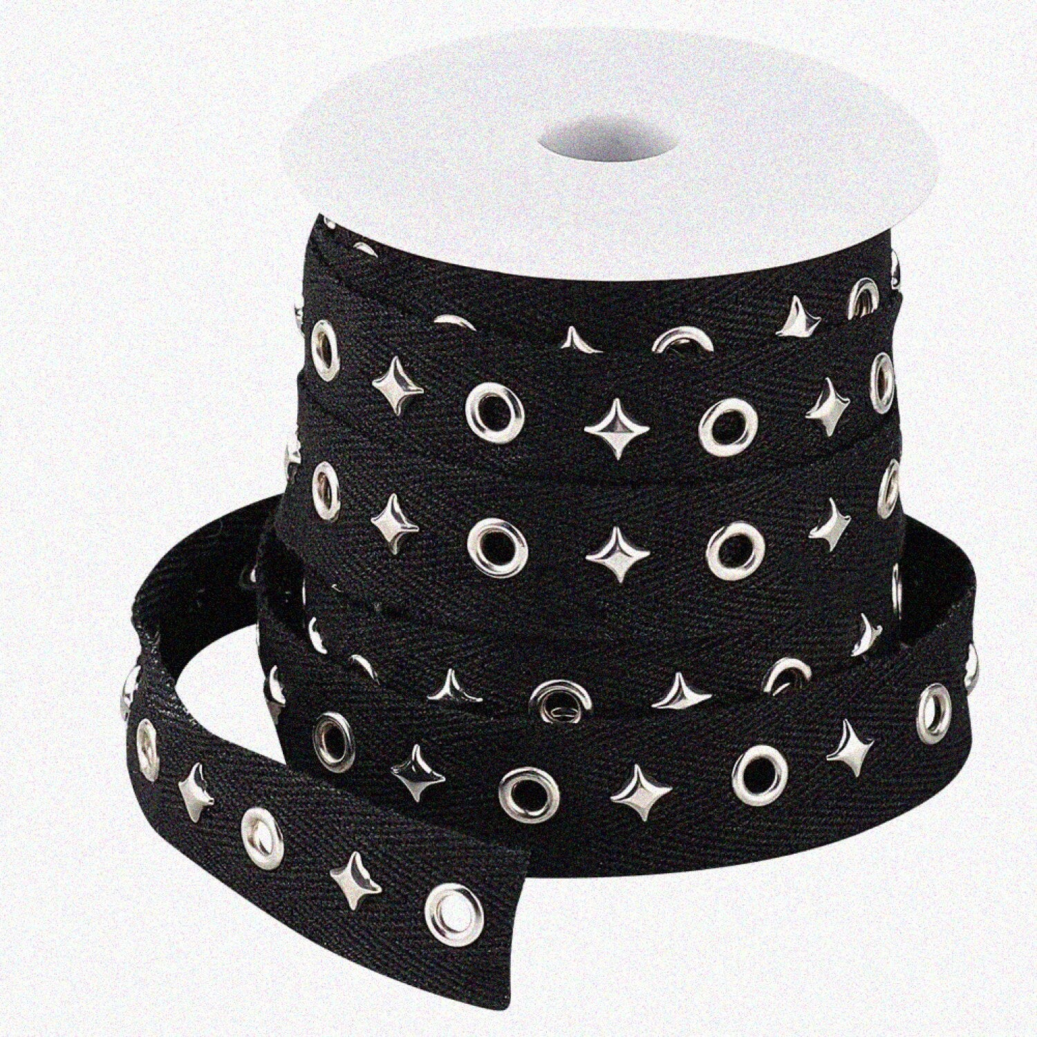 This set includes 10 yards of black cotton grommet tape featuring silver metal holes and decorative star patterns. Each strip measures approximately 3/4 inch (20mm) in width, with stars about 8x8x2.5mm in size. The versatile trim is suitable for a variety of garments such as dresses, jackets, T-shirts, skirts, and corsets. It can also be used to embellish everyday items like bags, purses, hairpins, curtains, and tablecloths. The black cotton material provides a durable and attractive decorative element, while the star-shaped patterns add a unique touch to your projects. The grommet tape is easy to sew onto fabric, making it ideal for both functional and decorative purposes. Whether used for clothing or home decor, this wide application trim offers a stylish way to enhance your creations with a distinctive star motif.