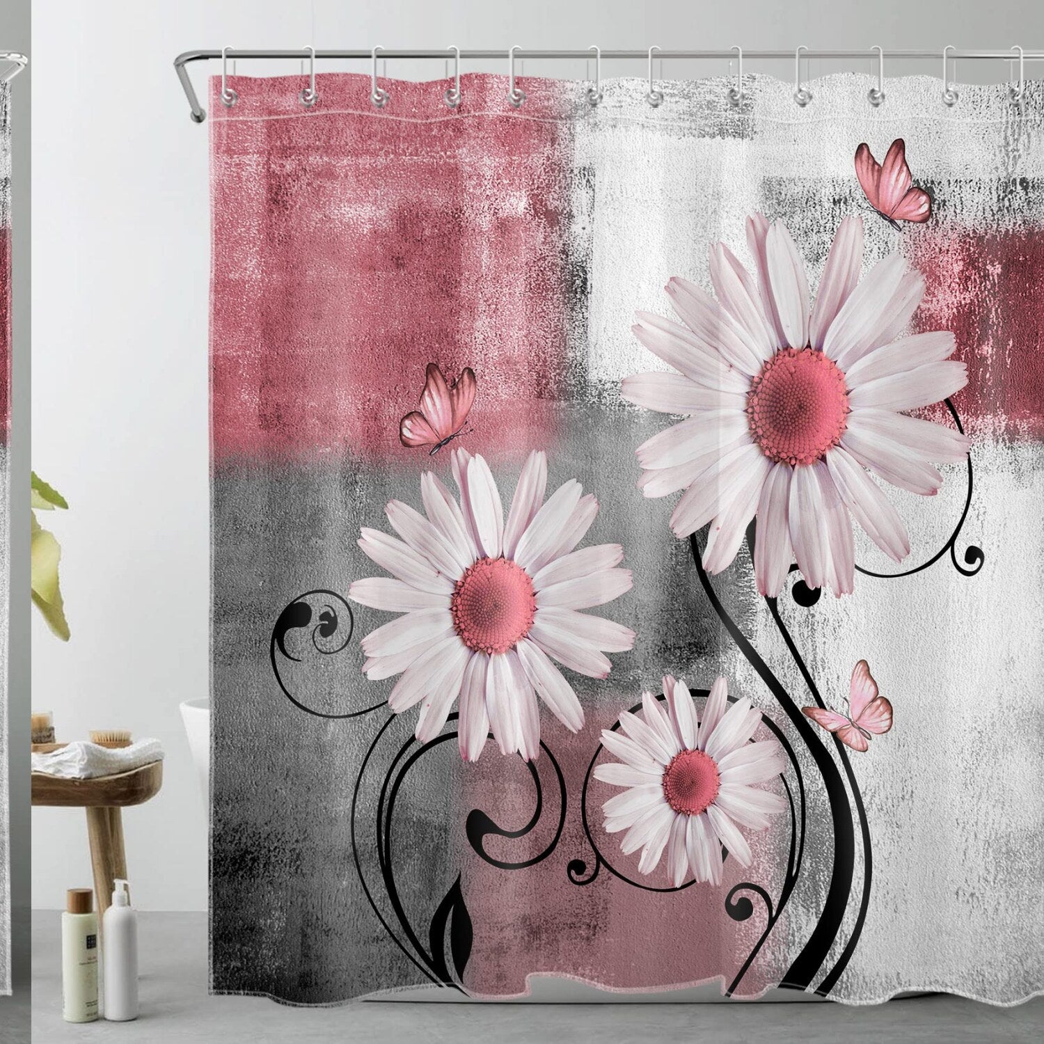 This farmhouse pink floral shower curtain features a charming floral design with butterflies, adding a touch of elegance to your bathroom. Made from hotel-quality polyester fabric, it is waterproof, durable, and super soft, ensuring a pleasant bathing experience. The HD digital printing technology provides clear, vibrant images that won’t fade over time, while environmentally friendly ink guarantees no odor or harm to health. The curtain measures 72 inches by 72 inches, suitable for most bathrooms, and can be used with or without a liner for added protection against water splashes. Its unique design combines rustic floral elements with modern abstract geometric patterns in grey and white, creating a personalized and stylish space. Easy to install with included rust-resistant hooks, it can be quickly hung and is simple to care for—hand or machine wash in cold water, avoid bleach, and tumble dry on low. Custom sizes and colors are available upon request.