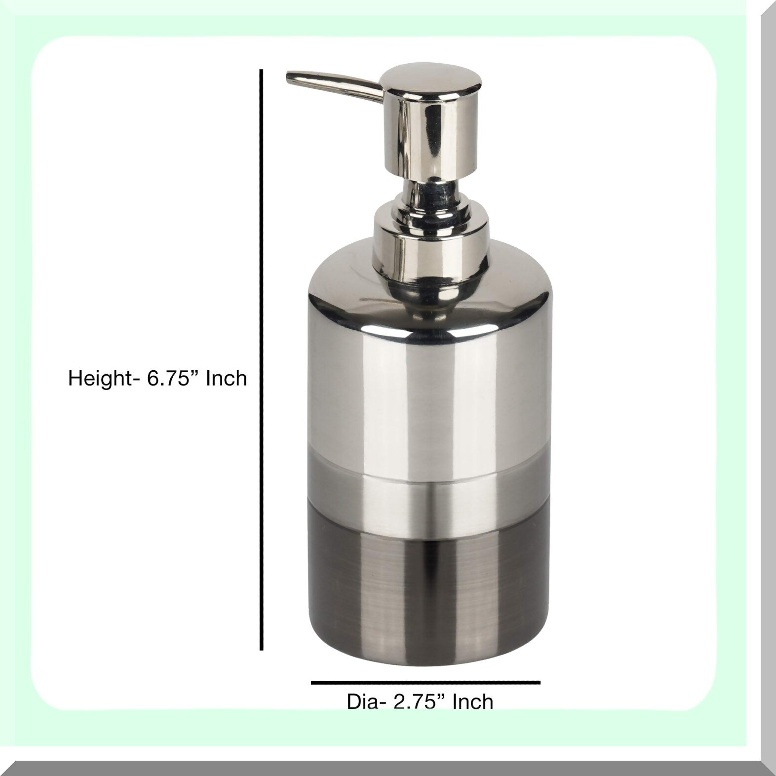 This set includes four bathroom accessories crafted from stainless steel with a three-tone shiny gray finish. The design features three distinctive bands: a polished stainless steel top, a brushed stainless steel middle, and a nickel-plated steel bottom, creating an elegant and exotic look. Handcrafted in India, these accessories add a refined touch to any bathroom or vanity space. The three-tone finish complements various color schemes, enhancing the overall aesthetic. Durable and stylish, this collection offers a sophisticated update to your bathroom decor.