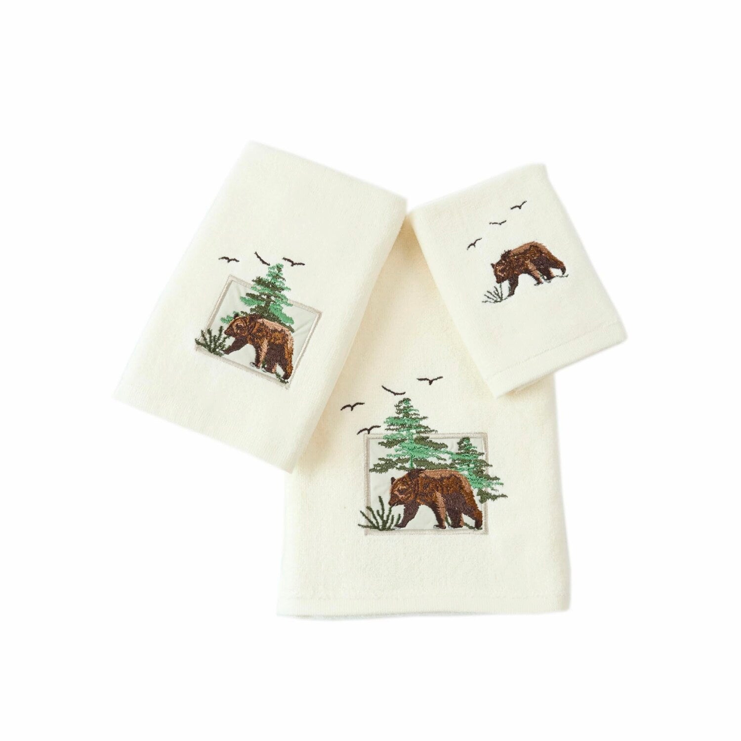 This premium luxury decor towel set features an ultra-soft 100% cotton construction with embroidered wildlife designs, including bears, birds, and trees on an ivory base pattern. Suitable for any bathroom, it can be hung or neatly folded in a closet. The set offers versatile functionality, ideal for drying cookware, dishes, utensils, and kitchen surfaces, as well as wiping countertops, appliances, and spills. It can also serve as a duster for furniture or be carried as party supplies or picnic hampers. Perfect for use in master bedrooms, guest rooms, kids' rooms, vacation homes, cottages, cabins, lake houses, mountain retreats, camping trips, or home staging. This embroidered jacquard towel set makes a thoughtful gift for family members or loved ones on birthdays, holidays, or special occasions. Crafted from pure cotton, it combines practicality with elegant wildlife-inspired design.