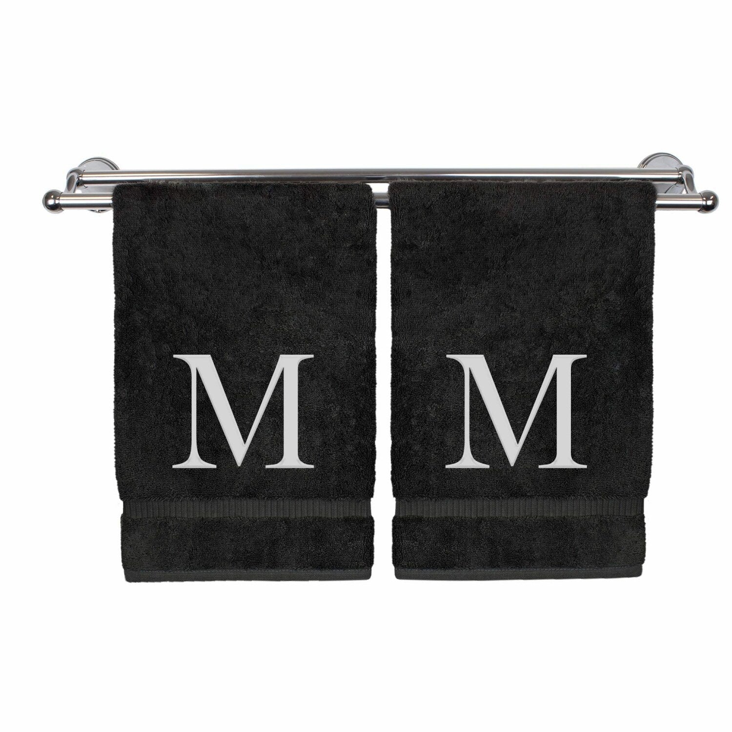 This set includes two monogrammed hand towels crafted from 100% Turkish cotton with a soft terry finish. Designed for everyday use, these towels are highly absorbent, extra fluffy, and fade resistant, providing a luxurious feel after each wash. Made from long-staple Turkish fibers, they maintain their softness and durability over time, adding a stylish touch to any bathroom decor. The towels feature a white background with a black block letter initial "M," offering a personalized and elegant detail. Perfect for gifting or personal use, they make an ideal present for holidays, housewarmings, weddings, Mother's Day, engagements, bridal showers, or birthdays. The set's classic size and design ensure they are versatile and functional, while the monogram adds a thoughtful, personal touch that elevates their appeal. Wrap yourself in comfort and style with these luxurious Turkish towels that combine practicality with a refined look.