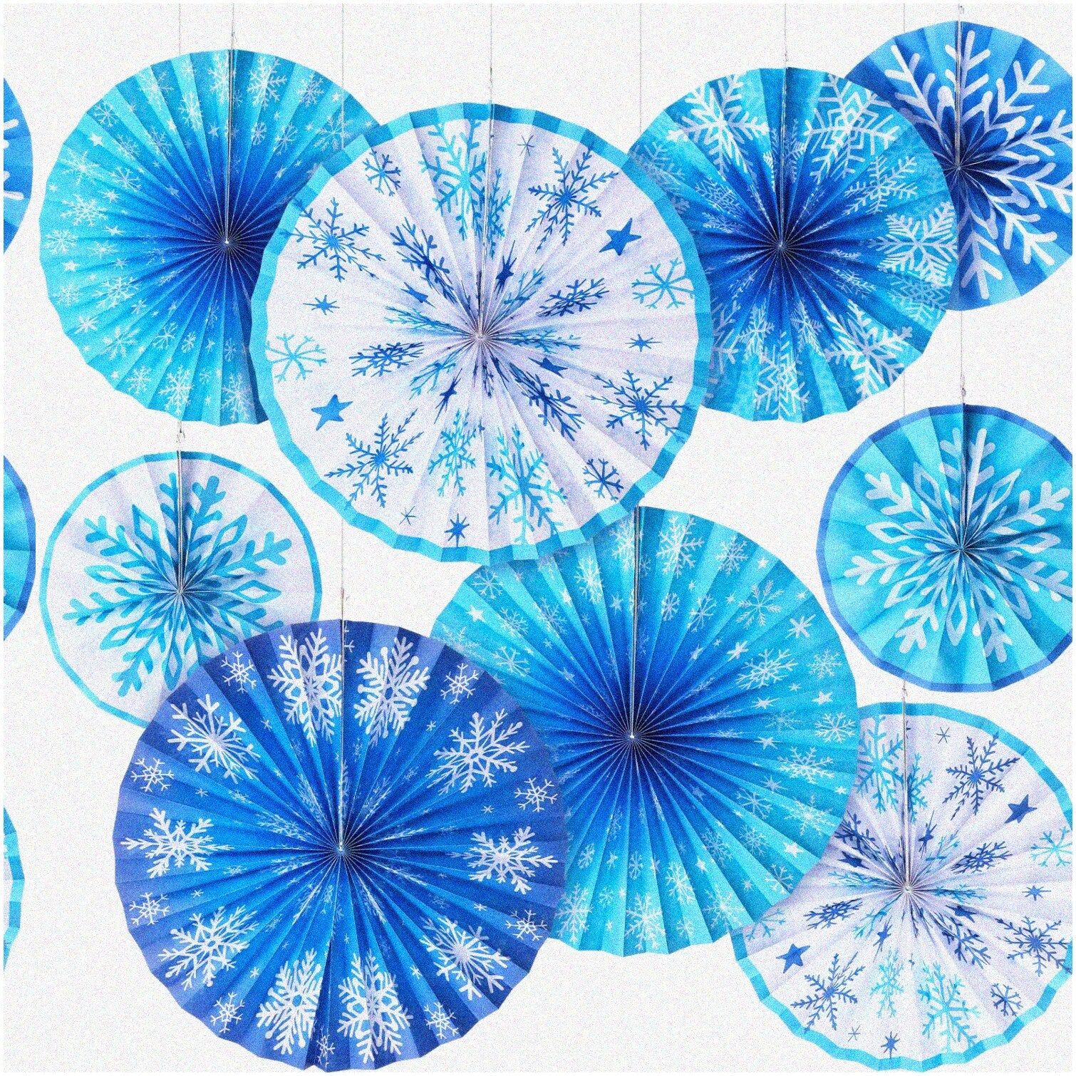 Create a festive winter atmosphere with this set of nine hanging paper fans featuring snowflake designs in blue and white. Perfect for decorating ceilings, walls, or tables at parties, birthdays, or seasonal events, these fans come in three sizes—8, 12, and 16 inches—with three fans of each size. Made from thickened paper, they are durable and maintain their three-dimensional shape, adding depth to your decor. Easy to assemble, each fan unfolds and can be secured with a self-sealing sticker or paperclip, and includes a hanging line for effortless display. Whether clustered together or combined with other decorations, these snowflake fans enhance the ambiance of winter-themed celebrations, holidays, or special occasions. Their vibrant colors and intricate patterns bring a whimsical touch to any space, making them a versatile choice for decorating ceilings, walls, or dessert tables. Perfect for creating a charming winter wonderland atmosphere.