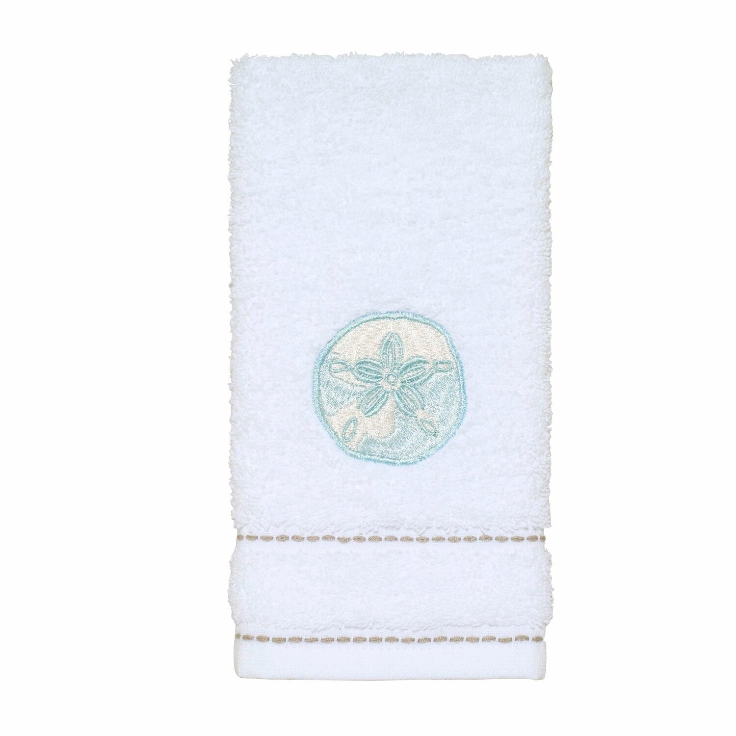 The Fingertip Towel features a soft, absorbent 100% cotton construction with a white terry surface. Embroidered with a light blue sand dollar, it adds a subtle coastal touch. The towel is bordered with two taupe broken horizontal polyester stripes, enhancing its farmhouse-inspired design. Perfect for bathroom use, this towel combines functionality with charming decor. Its lightweight and plush texture make it ideal for quick hand drying while adding a decorative element to your space. The towel is imported and part of a collection inspired by farmhouse aesthetics, emphasizing simplicity and natural beauty. Its design and quality make it a versatile addition to any bathroom decor, offering both practicality and style. The towel’s embroidered detail and border design create a refined look, making it suitable for everyday use or as a decorative accent.