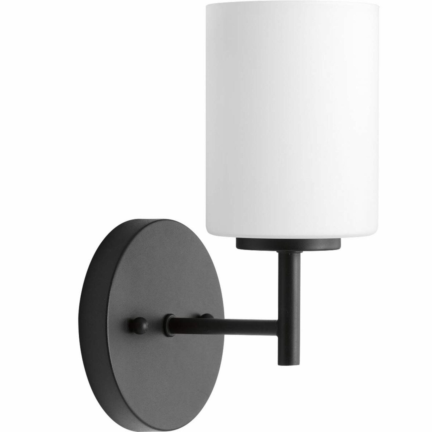 This modern one-light bath and vanity bracket features a textured black finish on a smooth, circular backplate, creating a refined aesthetic. The fixture has round bars that connect at a right angle, supporting a small, circular light base. An etched glass shade rests elegantly on the metal base, exuding quiet confidence and providing a restorative glow. Designed for optimal illumination, it uses one medium base bulb (sold separately) with a maximum of 100W, compatible with LED, CFL, halogen, or incandescent bulbs. Fully dimmable with a dimmable bulb, it can be installed in damp locations, offering versatile placement options. Mount facing up or down, around or over a bathroom mirror, it effectively eliminates shadows for daily routines. Its simple sophistication makes it suitable for coastal, luxury, modern, and transitional interiors, enhancing any bath or vanity setting with timeless elegance.