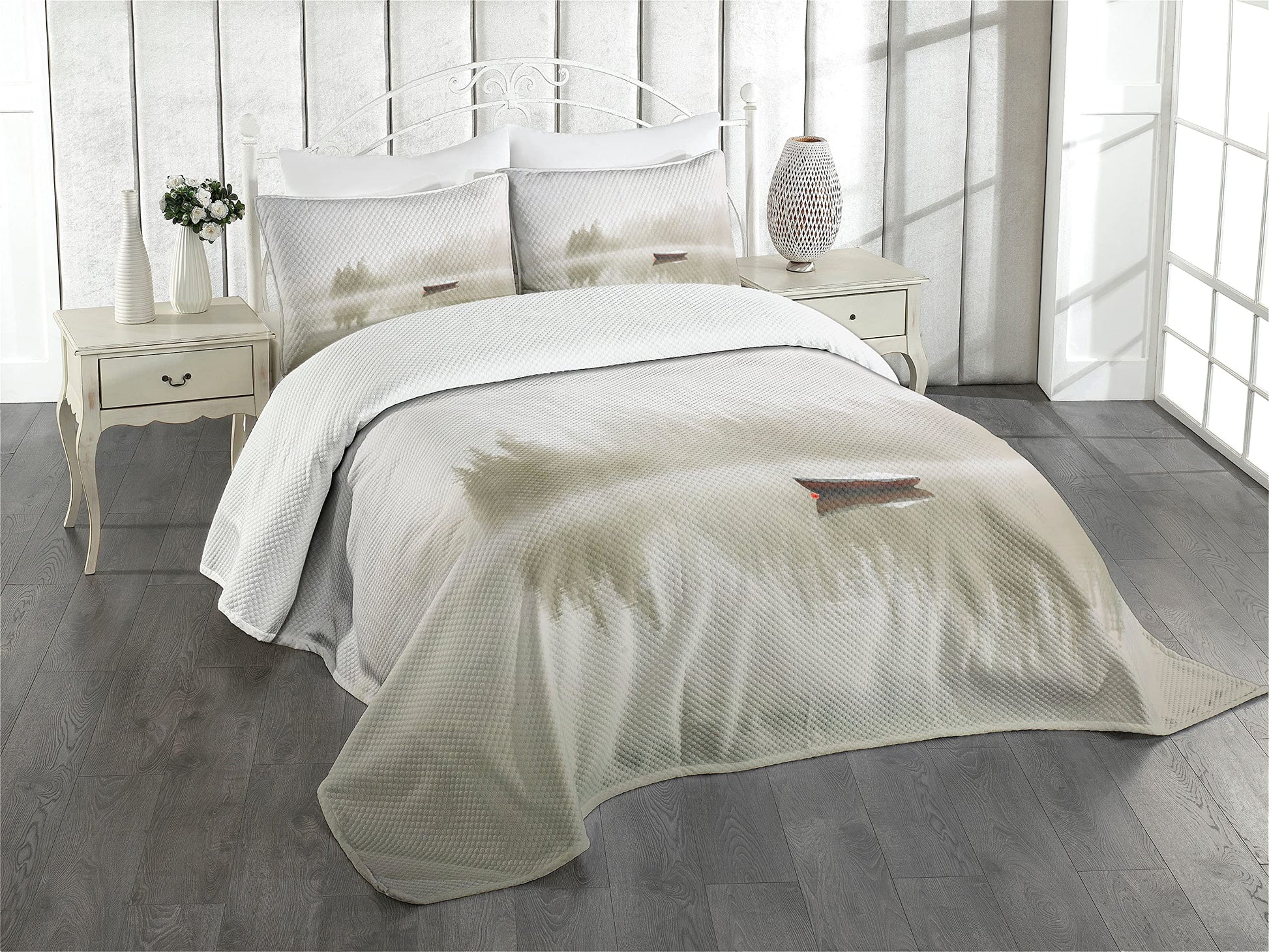 Landscape Bedspread, Boat on The Lake with Silhouettes of Trees on The Water Sky Nature Art, Decorative Quilted 2 Piece Coverlet Set with Pillow Sham, Twin Size, Eggshell Brown