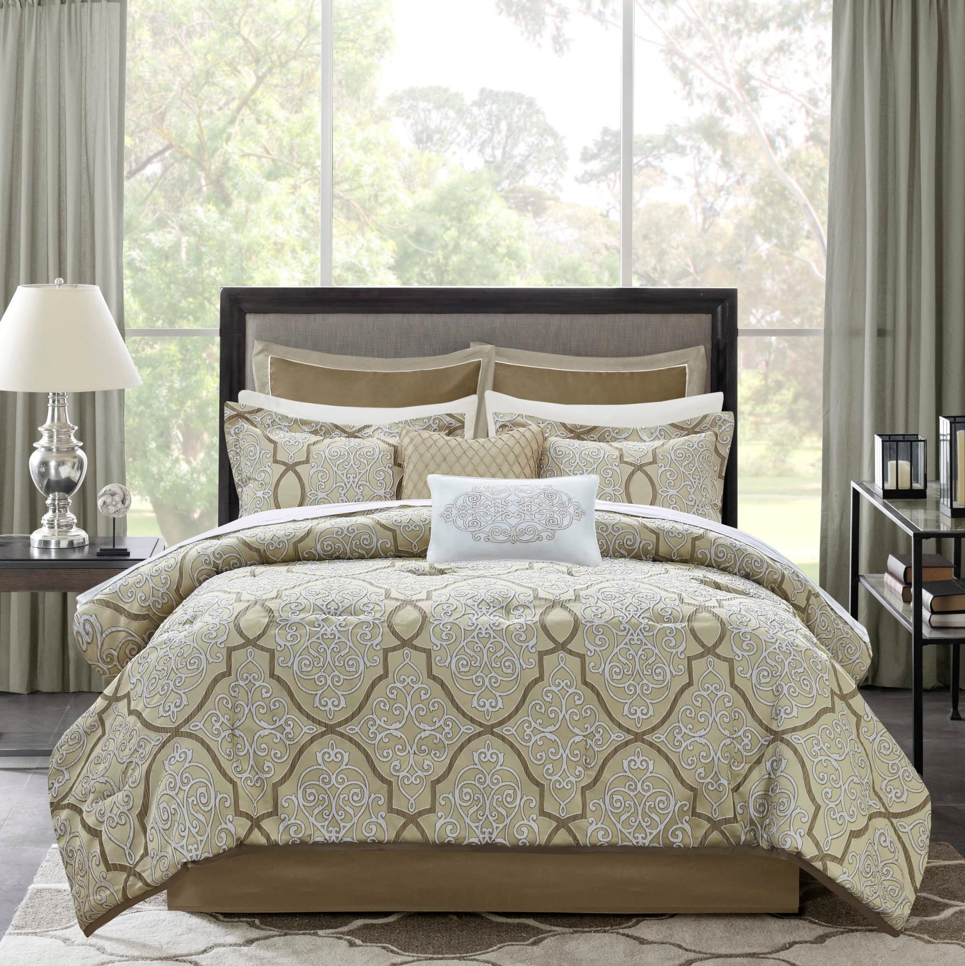 LaVine Cozy Bed in a Bag Comforter, Traditional Luxe Jacquard Design All Season Down Alternative Cover with Complete Sheet Set, Queen, Gold 12 Piece