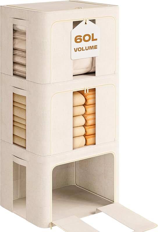 This set includes three large cloth storage bins, each with a 60L capacity and a sturdy metal frame for added support. The linen storage boxes feature clear windows for easy identification of contents. Designed to be stackable, these bins are ideal for organizing closets and maximizing space. They are suitable for storing sweaters, clothes, blankets, quilts, comforters, and T-shirts. The breathable fabric helps keep items fresh, while the durable construction ensures long-lasting use. These versatile storage containers help maintain a tidy environment and make it simple to access stored items. Their practical design is perfect for home organization, providing a convenient solution for keeping various clothing and bedding items neatly stored and easily accessible.