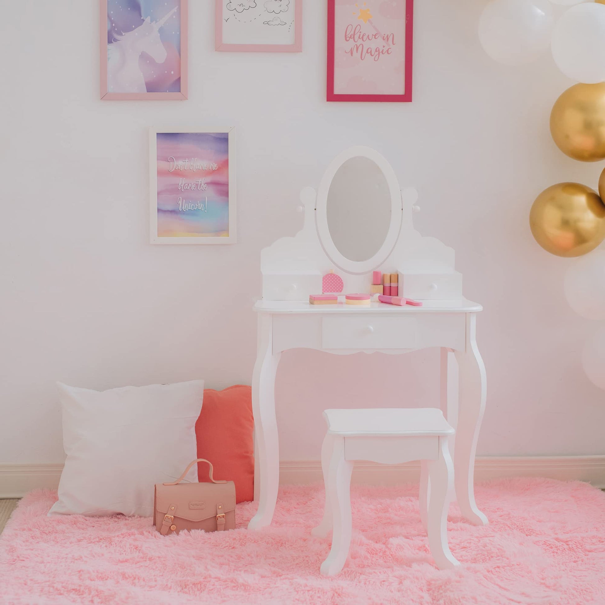 Give your little one a stylish place to get ready with our Little Princess Rapunzel Vanity Set. This cly vanity table with oval mirror features a matching stool that complete any playroom or bedroom, while the drawers provide storage for makeup, jewelry, accessories, and more. Three drawers provide plenty of storage space for makeup, hair supplies, jewelry, and other accessories. The rounded corners and durable MDF construction is kid-safe and easy to wipe clean, and the plexigl mirror provides a clear reflectio nd long-lasting use. The easy-to-follow instructions allow for quick adult embly so playtime can start right y. This kid-sized vanity table measures 23.75" long, 12" deep, and 38.75" tall and the stool measures 11.75" long, 10.75" deep, and 14" tall. Recommended for children 3 years and up.