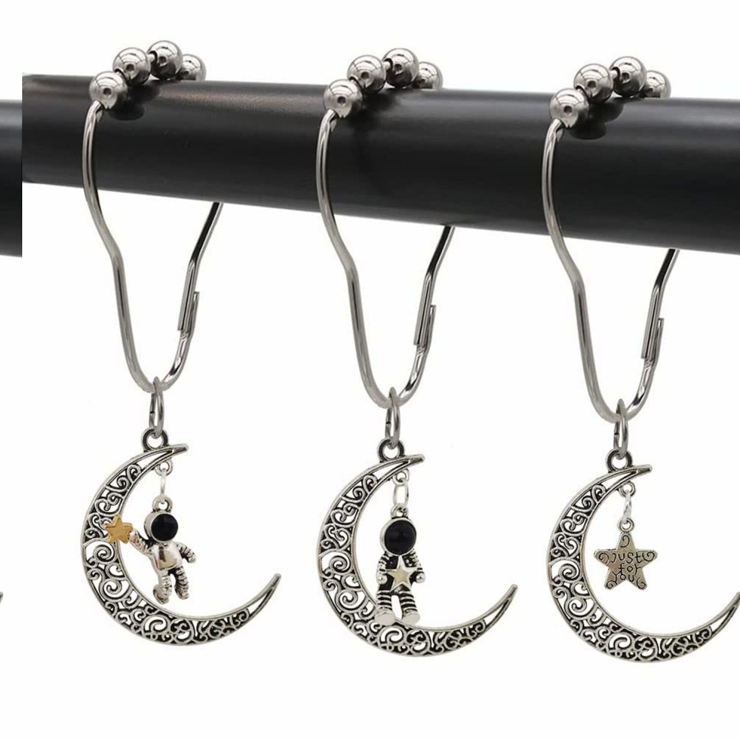 These astronaut shower curtain hooks are designed to enhance your bathroom decor with a fun space moon theme. Made from rust-proof, durable stainless steel, they resist rust and corrosion for long-lasting use. The roller ball design allows for smooth, friction-free gliding, making it easy to open and close your shower curtain. Each set includes 12 hooks and 12 moon astronaut pendants, providing a complete decorative solution. Installation is simple: open the clasp, stretch the ring around the curtain or liner, and loop it through the openings. Then, hang the astronaut pendant and snap the clasp shut. The polished, chrome-plated surface offers a sleek, attractive look, while the smooth finish ensures easy handling. These hooks are built to last, combining functionality with playful design, perfect for adding a touch of space-themed charm to your bathroom.