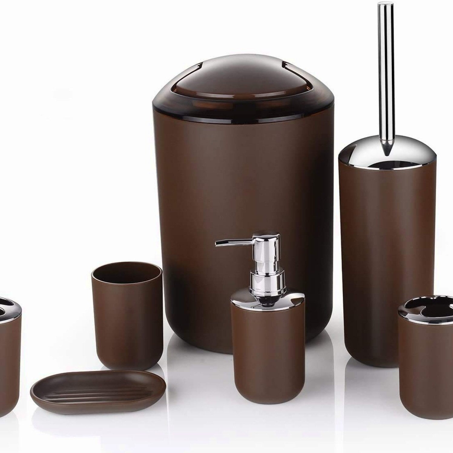 This 6-piece bathroom accessory set includes a soap dispenser, soap dish, toothbrush holder, rinse cup, tet brush with holder, and waste bin. Crafted from high-grade soft touch coating plastic, each piece features a sophisticated design in a trendy color. The soap dispenser stands 17cm tall with a 5cm diameter base, while the soap dish measures 2.5cm in height, 10cm in width, and 14cm in length. The toothbrush holder is 12cm high with a 5cm bottom diameter, and the rinse cup is 10.5cm tall with a 5cm diameter. The tet brush and holder reach 36.5cm in height, and the waste bin is 30cm tall with a 19cm diameter opening. This set combines functionality with stylish design, making it a practical addition to any bathroom.