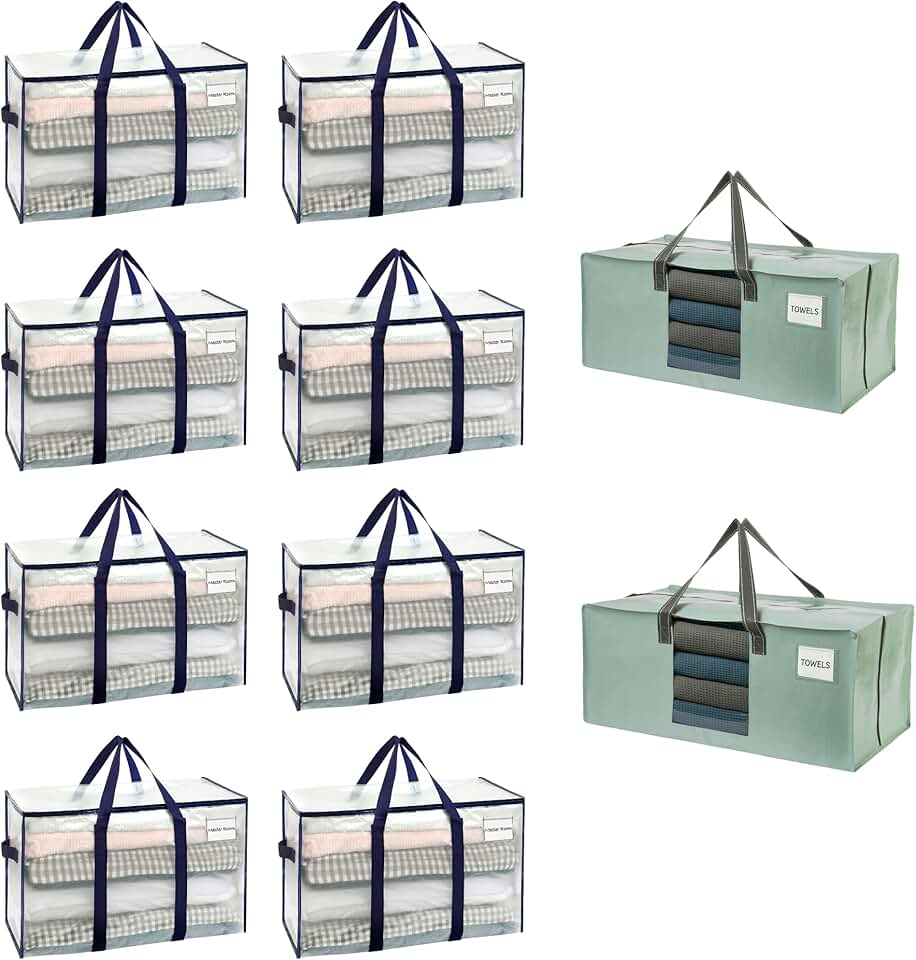 This set includes ten heavy-duty moving bags designed for efficient storage and transportation. The package features eight oversized clear storage moving bags, ideal for organizing large items and providing visibility of contents. Additionally, there are two large storage bags with windows, allowing easy identification of stored items. These durable bags are suitable for moving, storage, and organization needs, offering a reliable solution for handling bulky or numerous items. The clear design helps users quickly locate belongings without opening each bag, making packing and unpacking more convenient. Constructed from sturdy materials, these bags are built to withstand the rigors of moving and storage, ensuring long-lasting use. Their large capacity makes them suitable for various household or office items, providing a practical and organized approach to managing belongings during transitions. This bundle offers a comprehensive set of storage options to facilitate a smooth moving or organizing process.