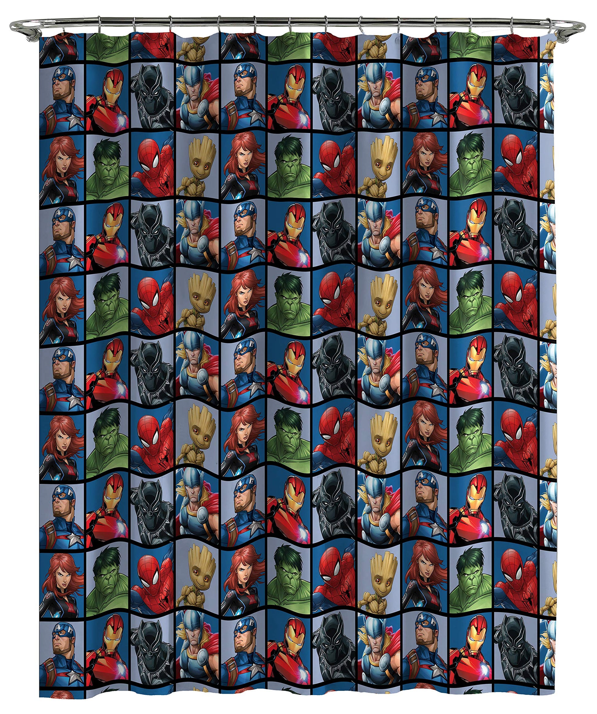 Transform your bathroom with this Marvel Avengers Team shower curtain and matching 12 piece hooks set! The Avengers shower curtain and matching hooks set will bring your home bathroom to life. Featuring Hulk, Spiderman, Groot Black her, Black Widow, Captain America and Thor, this set includes 1) Shower Curtain 72 x 72 inches and 12-Piece Hook Set. Made of 100% Polyester microfiber. Easy care, machine wash cold and tumble dry low. 100% Acrylic hooks are built to last, easy care spot clean only. Marvel Avengers shower curtain 12 piece hook set is the perfect gift for your loved one featuring designs with characters and scenes from their favorite Movie. This set is sure to make shower and bath time fun and exciting!