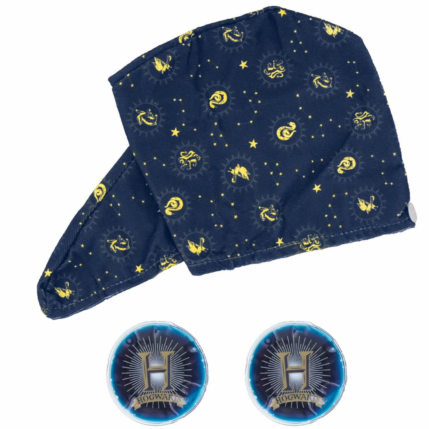 The Harry Potter Beauty Relax Set includes a quick-dry hair turban and cooling gel pads, all featuring a rich navy blue background with golden detailing. The microfiber hair turban absorbs more water than traditional towels, reducing blow-drying time and minimizing heat damage, resulting in healthier, fuller, and shinier hair. The cooling gel pads are designed to help reduce dark circles; simply place them in the fridge for two hours before use and comfortably position over the eyes. The turban is decorated with a constellation-inspired design that incorporates the four Hogwarts houses—Gryffindor, Slytherin, Ravenclaw, and Hufflepuff—in a striking golden color. This set offers a relaxing and rejuvenating experience, perfect for unwinding after a shower. It makes a thoughtful gift for any Harry Potter fan, providing both practical use and a touch of magic to their self-care routine.