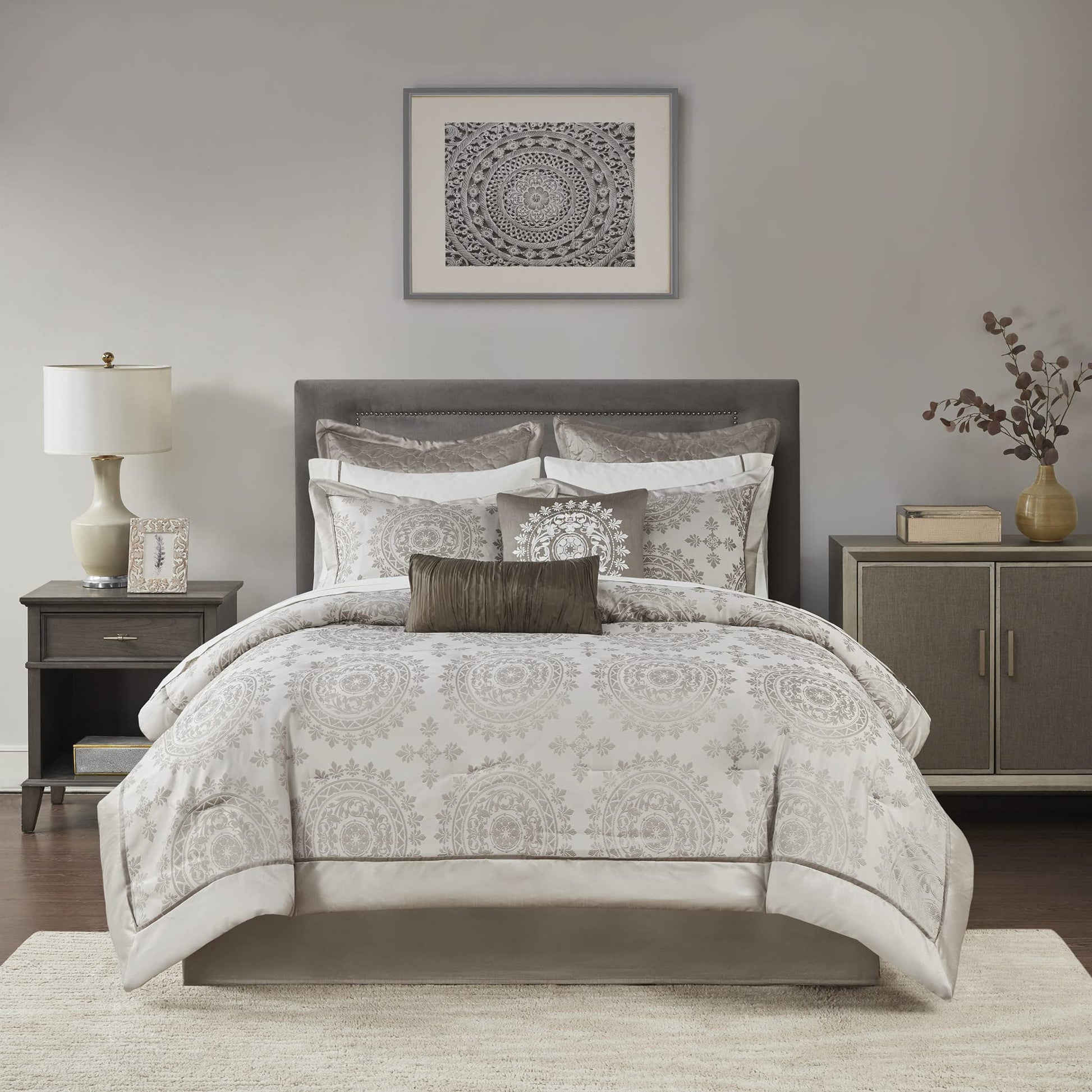 For an updated clic look, Tiburon is a perfect way to give your bedroom a new look. The medallion motif is woven in a taupe color on an ivory base.