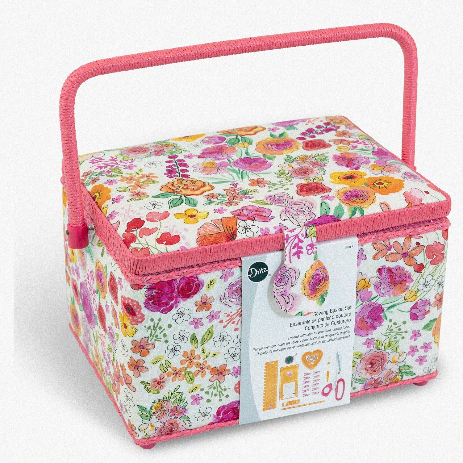 This sewing basket set features a colorful floral print with a bright pink interior and coordinating orange and pink sewing tools. The set includes fabric cutting shears, a magnetic pin holder with heat-resistant glass head pins, a small blade seam ripper, hand needles, mini clips for holding fabric layers, a tape measure, a ruler, and a marking pencil. A charming cherry-sized tomato pin cushion is also included. The basket has a sectioned removable tray for organized storage, an attached pocket and pincushion inside the lid, and a magnetic snap closure for secure closing. The basket measures 11 inches, making it a practical and vibrant choice for both beginners and experienced sewists.