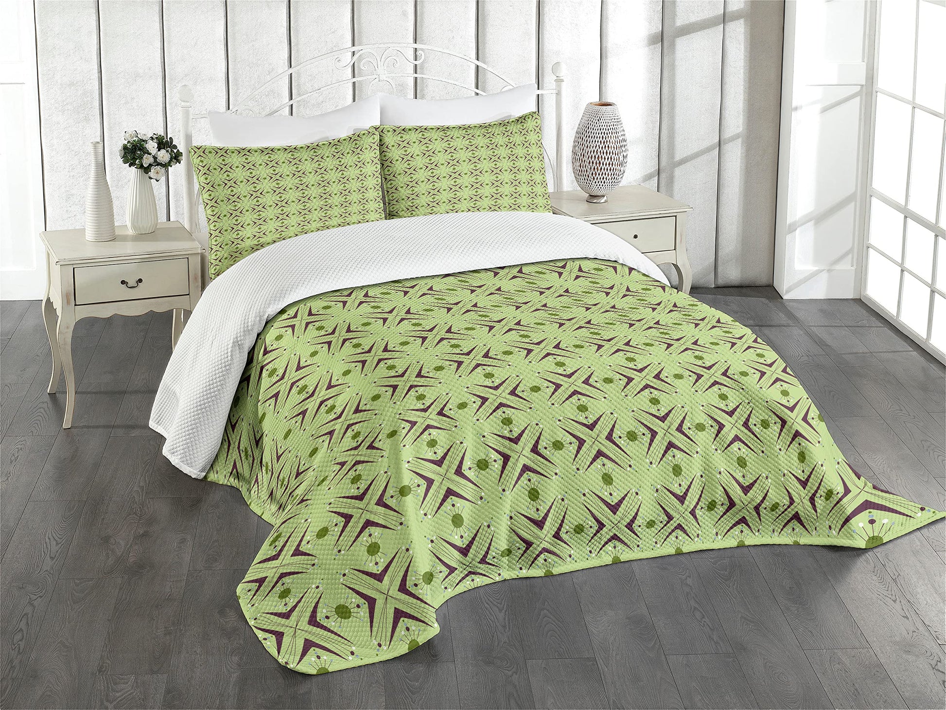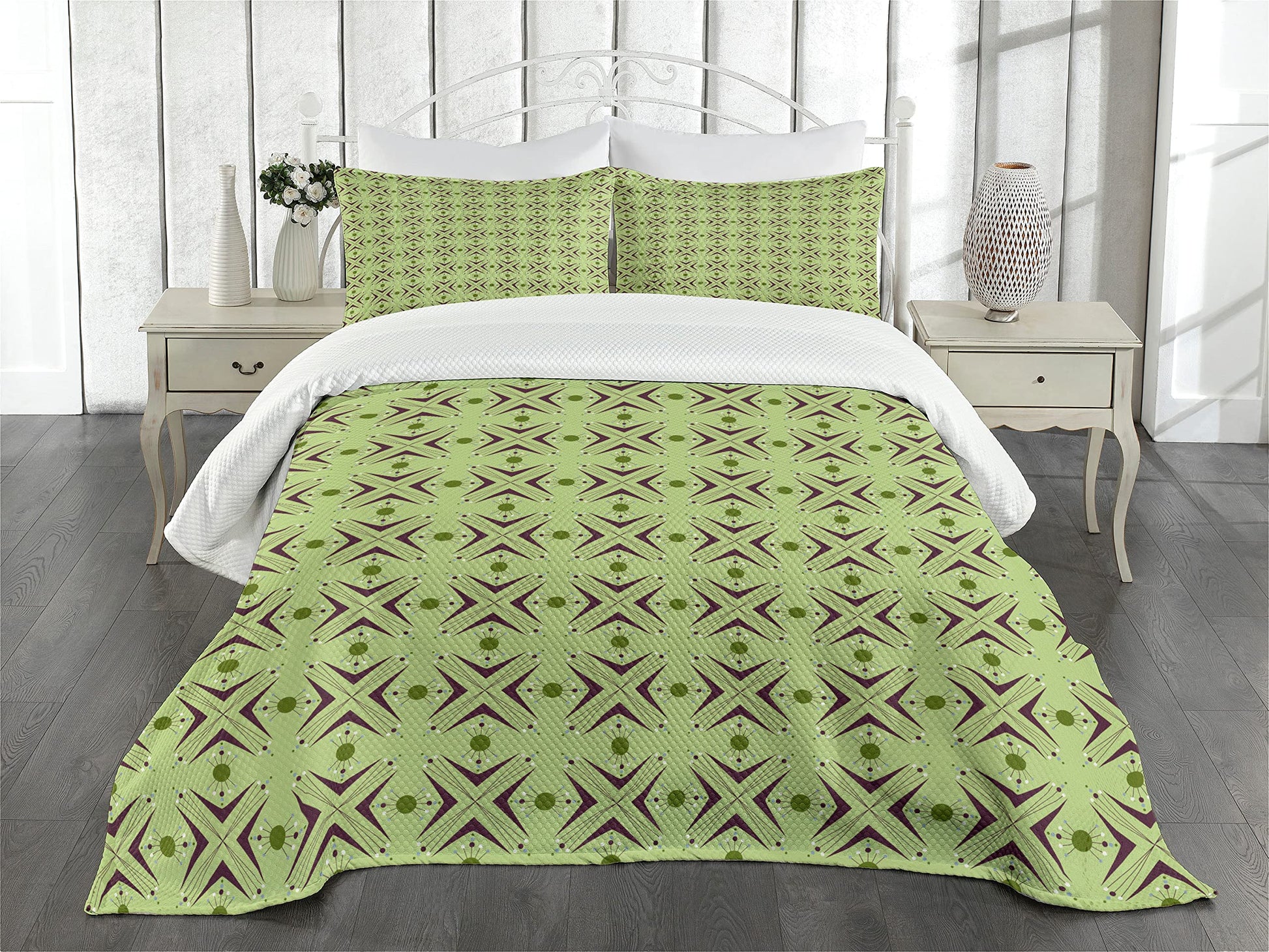 Mid Century Bedspread, Atomic Form Boomerang Details Dots and Crossed Lines, Decorative Quilted 3 Piece Coverlet Set with 2 Pillow Shams, Queen Size, Green Plum