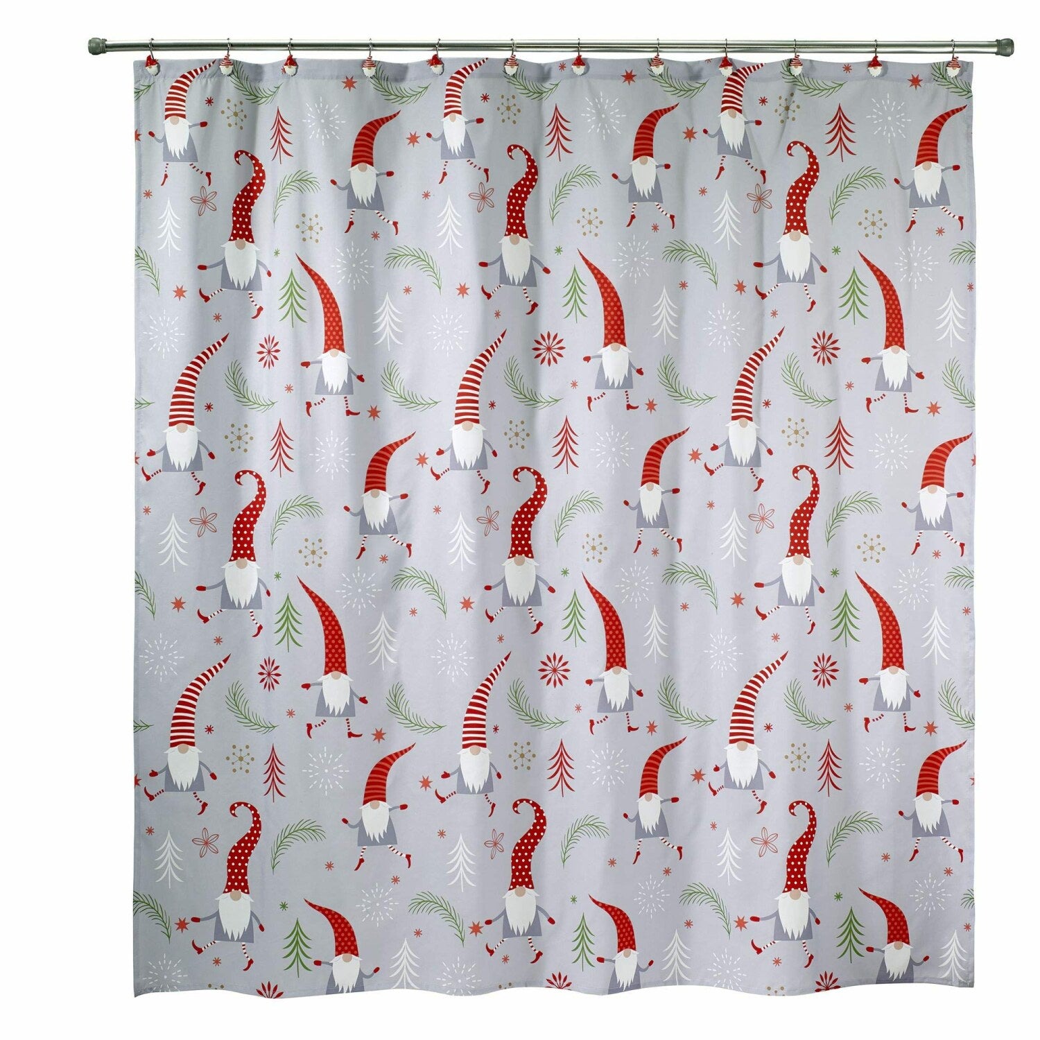 The Fabric Shower Curtain from the Gnomes Walk Collection measures 72" x 72". It features a charming design of adorable gnomes walking among whimsical branches, trees, and stars, all printed on a grey background. Crafted from 100% polyester, this shower curtain offers easy care and durability. It includes one shower curtain, providing a delightful addition to any bathroom decor.