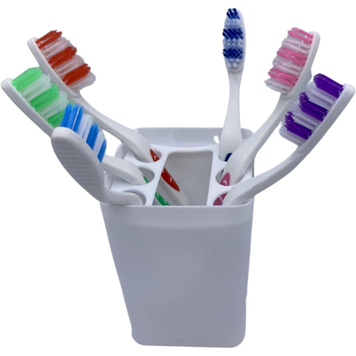 6-ct of tooth brushes with cup & holder. Handle is made of soft rubber and plastic with a cushion grip.