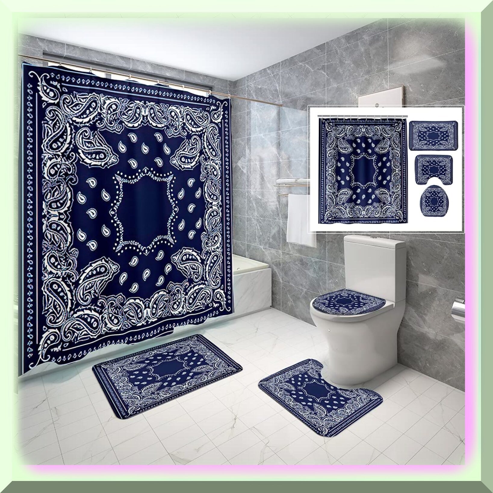 This 4-piece bathroom set includes a waterproof shower curtain, non-slip bath mat, tet lid cover, and soft U-shaped rug. The shower curtain features white and blue geometric line patterns on a white background, printed with high-definition digital technology for clear and vivid design. Made from polyester, it offers a good waterproof effect, is soft, easy to hang, and resistant to fading. The bath mat is crafted from flannel, providing effective non-slip support to enhance safety during bathing. The set also includes 12 hooks for easy installation on standard-sized shower or bath areas, compatible with straight or curved rods. Suitable for homes, apartments, hotels, dormitories, and clubs, this set combines practicality with decorative appeal. The high-resolution prints add artistic flair to your bathroom, making it both functional and visually appealing. Please note that slight color variations and size differences may occur due to lighting and manual measurement.
