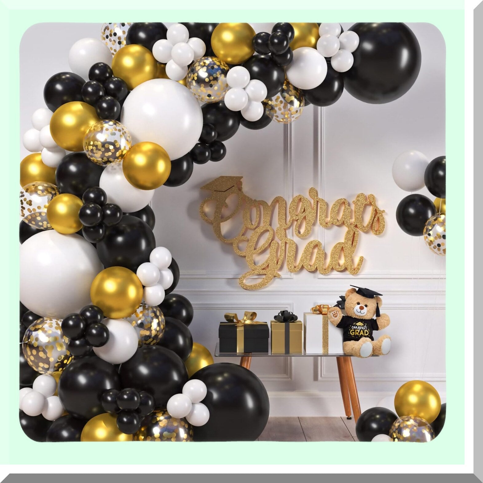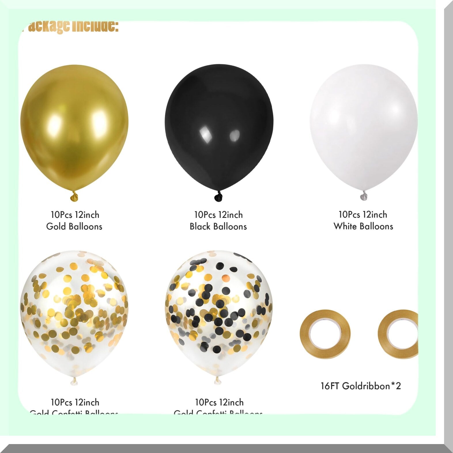 This set includes 50 high-quality latex balloons in black, white, and gold, with a mix of solid and confetti-filled designs, along with two rolls of gold and white ribbons. Each balloon inflates to approximately 12 inches, suitable for indoor and outdoor party decorations. The durable, eco-friendly balloons are non-odor and resistant to popping, and can be filled with air or helium. Perfect for various celebrations such as birthdays, baby showers, graduations, anniversaries, and New Year events, these balloons create vibrant backdrops and memorable photo opportunities. To enhance the confetti effect, rub the balloons on hair or fabric and shake gently to distribute the confetti evenly. After the event, popping the balloons releases the confetti for added fun. Customer satisfaction is a priority, with prompt support available for any questions or suggestions. This versatile balloon kit is ideal for decorating any festive occasion.