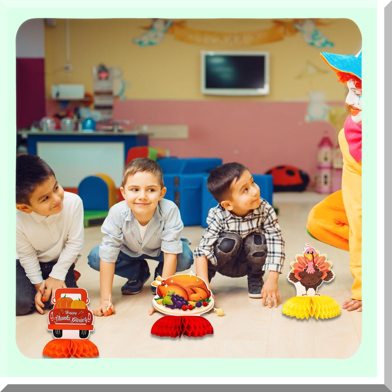 Set of nine Thanksgiving honeycomb decorations featuring autumn-themed designs including turkeys, pumpkins, maple leaves, and gnomes. Made from durable cardstock and honeycomb paper with vibrant printing, these decorations are reusable and long-lasting. Easy to assemble, they can be quickly set up to enhance the festive atmosphere at your celebration. Each piece measures approximately 15-17cm in length and 14.8cm in width, adding a charming touch to tables and display areas. Suitable for Thanksgiving, autumn parties, themed birthdays, baby showers, and other seasonal events, these versatile decorations help create a warm and inviting environment. Perfect for home, office, or party settings, they serve as eye-catching centerpieces or accents. The package includes nine uniquely designed honeycomb decorations, providing a variety of styles to meet your decorating needs and elevate your event decor.