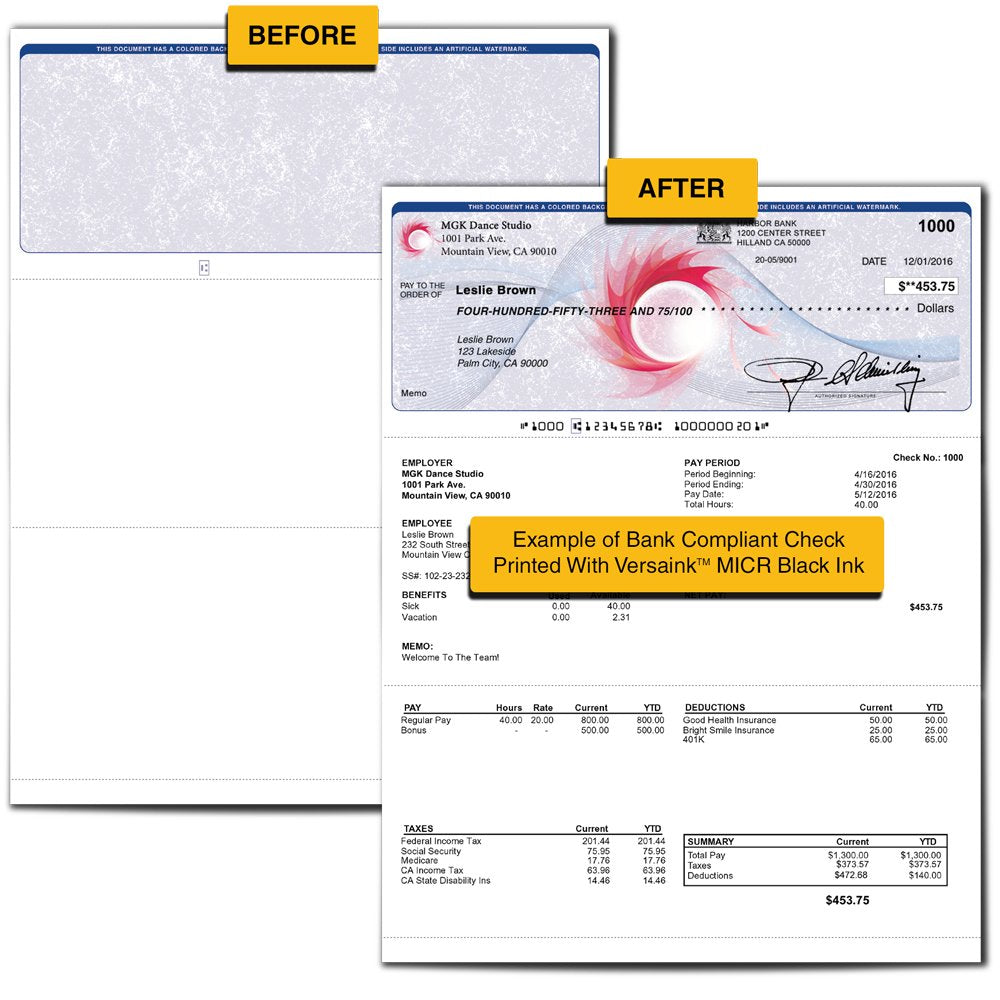 Use -nano 67 MS MICR Black Ink Cartridges in your inkjet printer to generate 100% bank compliant checks. The bank code line on the bottom of every check is required to be printed with magnetic (MICR) ink to be readable by Magnetic Ink Character Recognition devises (MICR check readers) used at retail and financial outlets everywhere.