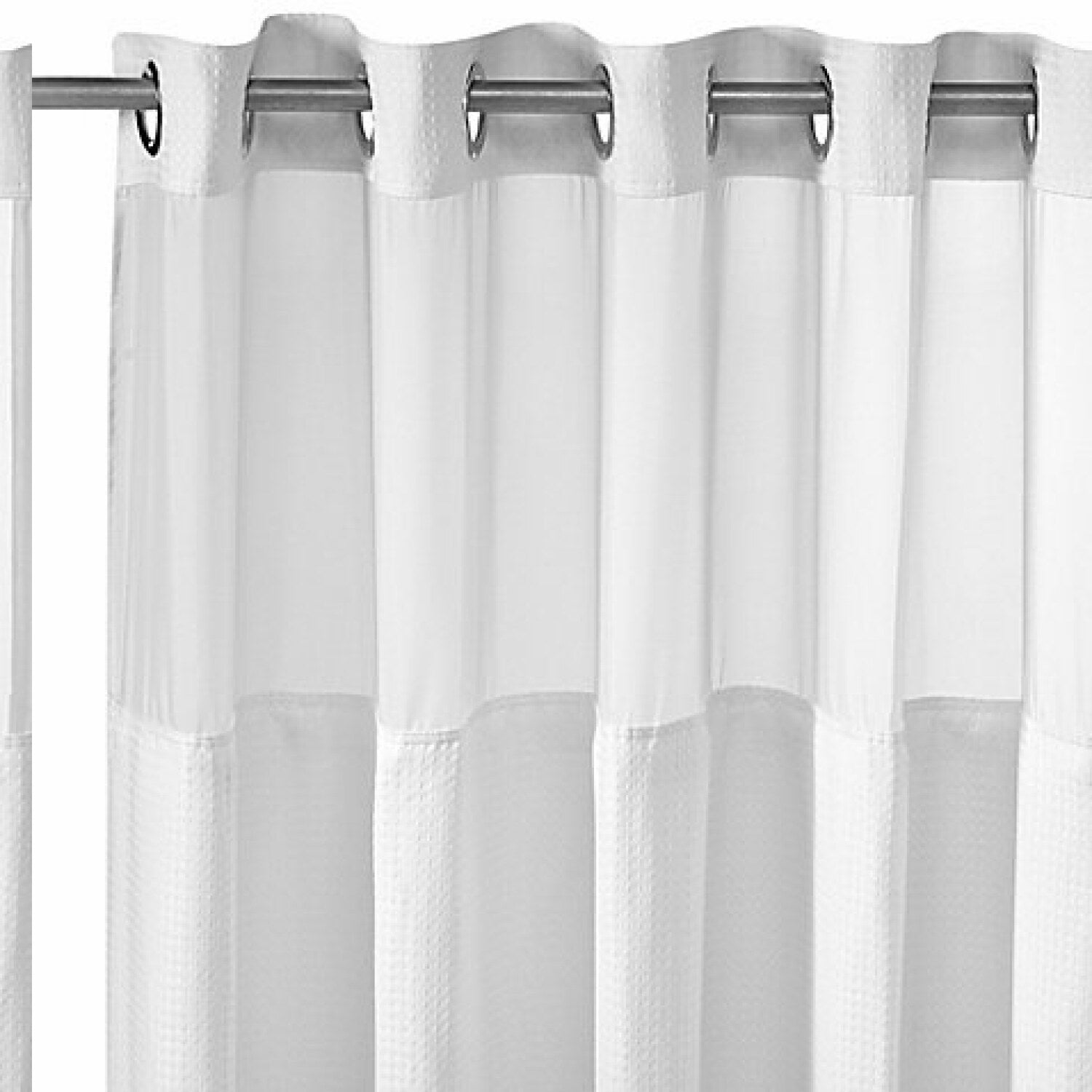 This 71" x 74" shower curtain features a 3-in-1 set that includes a fabric curtain, built-in rings, and a PEVA replacement liner. Made from 100% polyester with a dobby weave, it offers water resistance for added durability. The snap-in PEVA liner is designed to repel water and easily snaps on and stays in place, allowing for quick installation without removing the shower rod. The built-in FLEX-ON rings eliminate the need for separate hooks, simplifying setup and removal. This white shower curtain combines functionality and convenience, providing a stylish and practical addition to any bathroom.