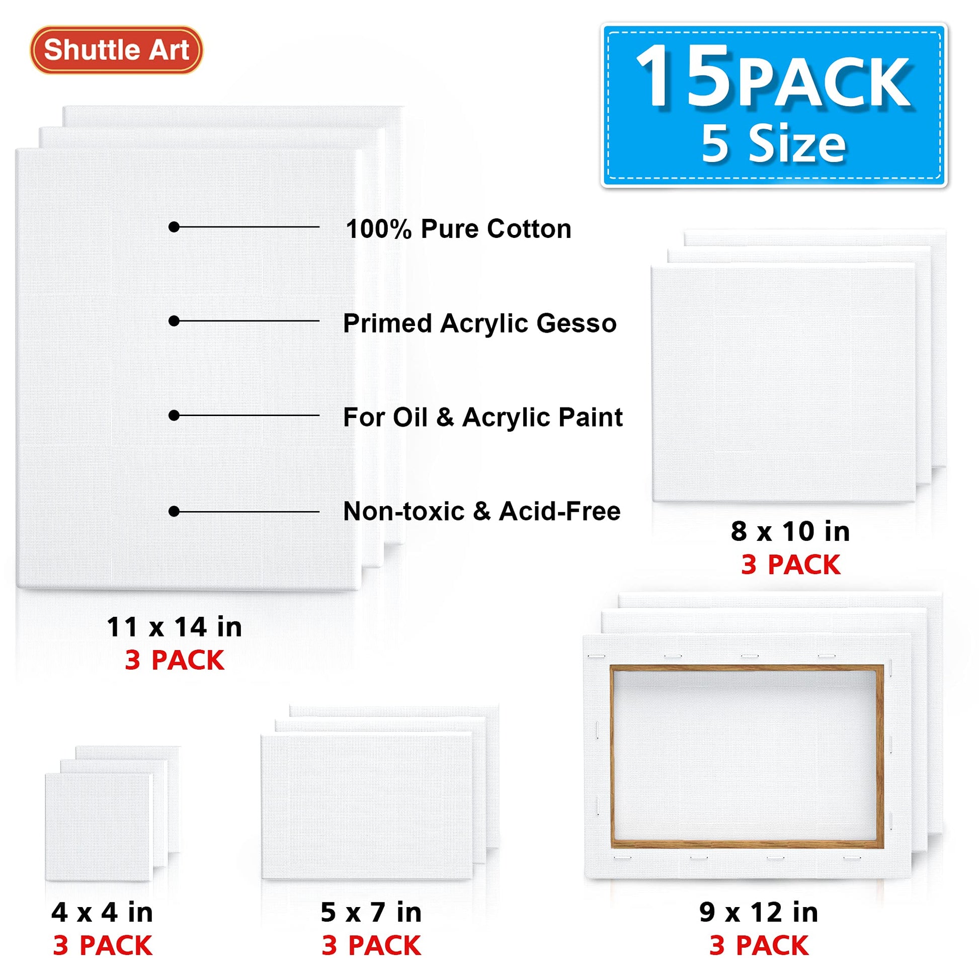 This set includes 15 blank stretched canvases in various sizes: 4x4, 5x7, 8x10, 9x12, and 11x14 inches, with three of each size. Made from 100% cotton, these canvases feature a smooth textured surface that allows brushes and painting knives to glide easily. They are primed to the right level, enabling color mixing and blending without bleeding, so you can start painting immediately. The sturdy frames are well-constructed, with canvases stretched and stapled securely on the stretcher bars to maintain a tight, flat surface. Suitable for a variety of media, including oil, acrylic, tempera, gouache, and watercolor paints. These canvases are non-toxic, acid-free, and conform to ASTM-D4236 standards, making them suitable for artists, students, and kids for daily practice and creative projects. Your satisfaction is our priority; feel free to contact us with any questions or concerns.