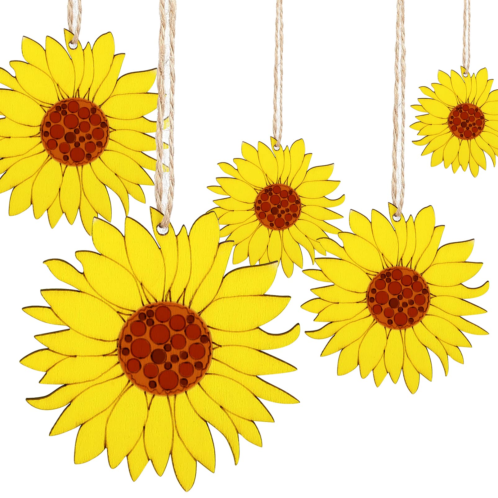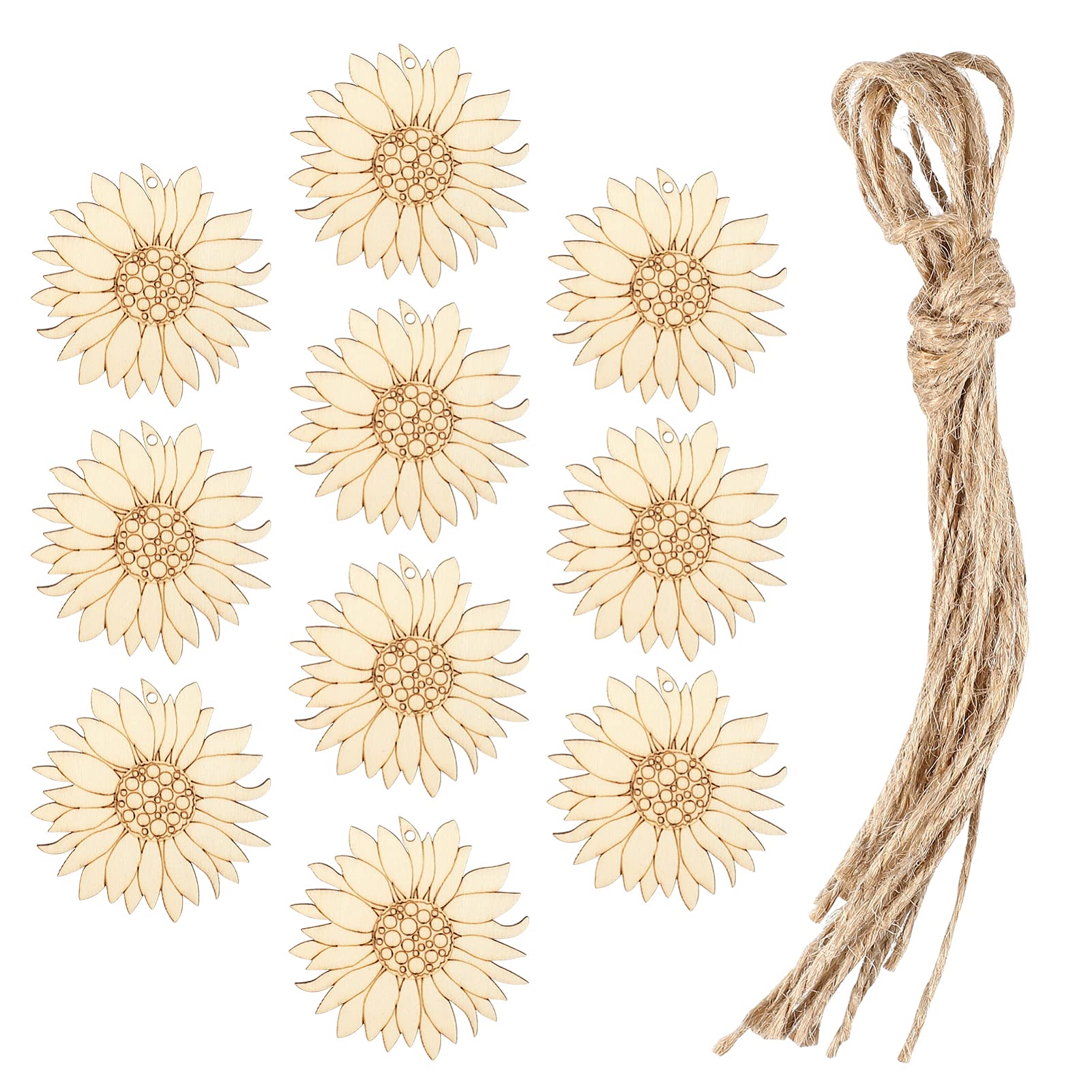 A set of 10 wooden sunflower slices designed for creative projects and home decor. These unfinished wood chips serve as a blank canvas for painting, dyeing, gluing, or carving, allowing for personalized DIY crafts. Each slice features a unique sunflower petal design, blending naturally with various decor styles to create a romantic atmosphere. Made from smooth wood, they provide a comfortable and safe hand feel, making them suitable for all ages. Perfect for decorating walls, tables, corridors, or trees, these versatile slices offer endless decorating possibilities. They are also ideal for crafting activities, enabling you and your child to bond through creating custom accessories like pendants or embellishments. The package includes 10 sunflower wood chips and 10 jute ropes, providing everything needed to start your creative journey. These charming wooden slices are perfect for weddings, parties, or everyday home decor projects, inspiring your imagination and adding a natural touch to any space.