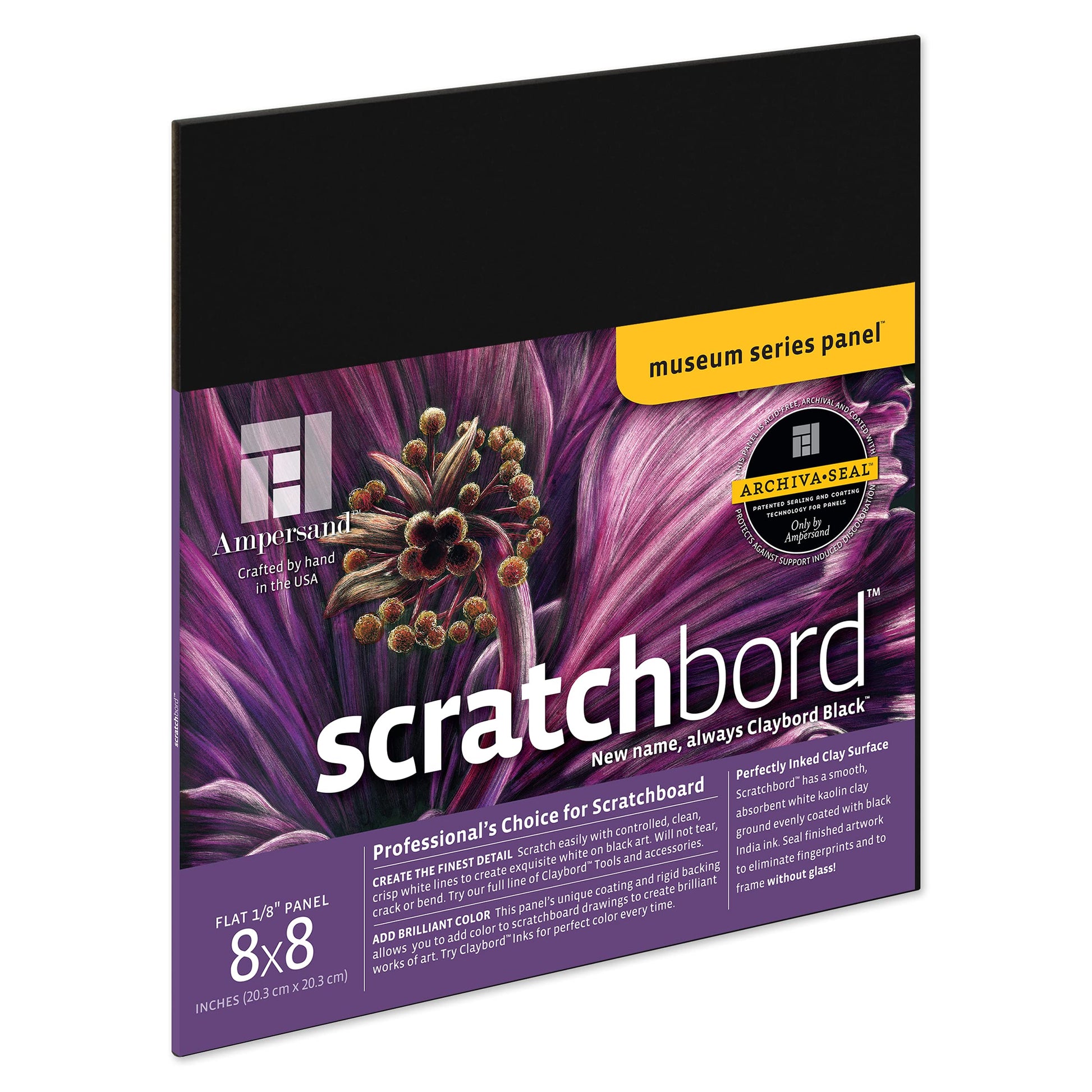 This 8" x 8" scratch panel features a 1/8" flat profile made from warp-resistant FSC-Hardbord, providing a durable and stable surface for creative projects. The surface is coated with a velvety-smooth, acid-free kaolin clay ground infused with India ink, offering an absorbent and seamless drawing experience. Sealed with an exclusive Archiva-Seal, the panel is protected against ripping, tearing, bending, and wrinkling, ensuring long-lasting preservation of your artwork. Unwanted scratch marks can be easily repaired by reapplying India ink or specialized repair ink, allowing for effortless corrections. The panel's pristine white surface is ideal for adding vibrant colored inks, creating depth and dimension in your artwork. Eco-friendly and formaldehyde-free, this handcrafted panel is designed for durability and quality. Perfect for showcasing and preserving your creative masterpieces without the need for glazing, this scratch panel combines functionality with artistic versatility.