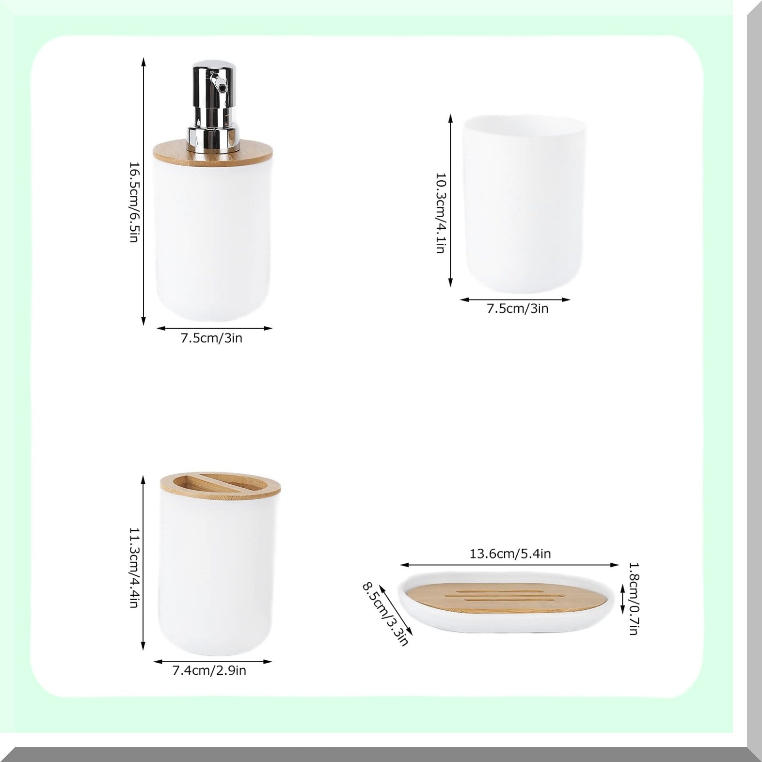 This set includes four essential bathroom accessories: a toothbrush cup, a toothbrush holder, a lotion dispenser, and a mouthwash cup. Made from durable plastic and bamboo, each piece is designed for long-lasting use. The toothbrush cup measures approximately 7.4x7.4x11.3cm, while the mouthwash cup is about 7.5x7.5x10.3cm. The lotion dispenser stands around 7.5x7.5x16.5cm, and the storage box is approximately 13.6x8.5x1.8cm. The set weighs about 300g. Its simple, modern design offers an elegant aesthetic that enhances your bathroom decor. The smooth, waterproof surface ensures easy cleaning and resistance to reactions with typical health care products, promoting sustainability and reuse. This versatile collection fully meets your daily washing needs, providing a structured and visually appealing addition to your bathroom space.