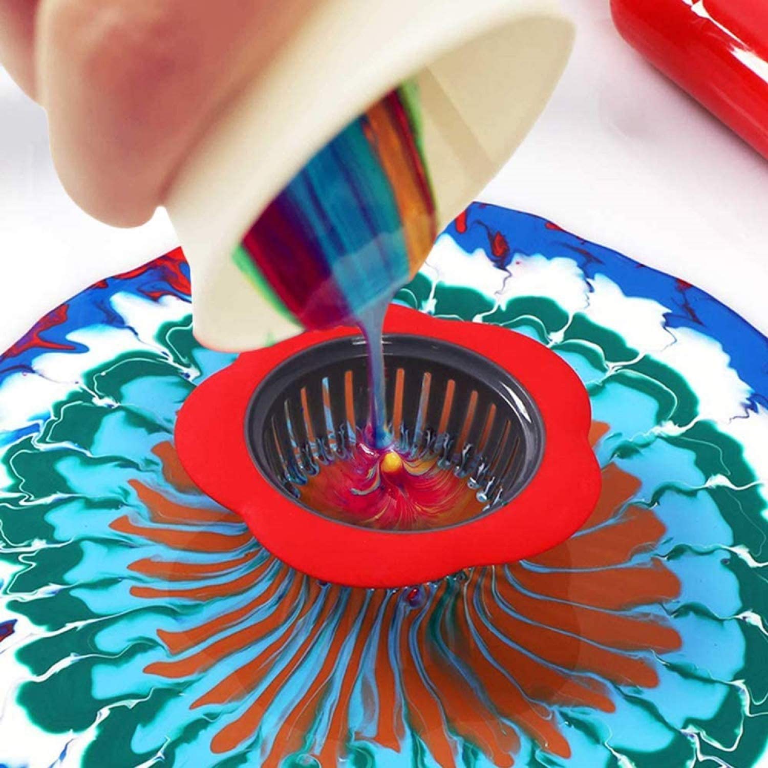 A set of 13 acrylic pouring strainers made from durable silicone and plastic, featuring various hole patterns to inspire creativity. Each strainer measures between 3" and 5" and is designed for repeated use, easy to clean with water. These versatile tools are ideal for creating unique patterns by pouring mixed pigments through the different designs, producing visually appealing effects. Suitable for artistic projects, they can also be used as drain baskets for bathrooms, kitchens, or washrooms. The set includes a strainers spoon for precise pouring. Perfect for artists and children alike, these strainers stimulate imagination and help develop artistic skills. They are compatible with acrylic pouring, dessert decoration, and other creative applications. The colorful assortment of strainers offers multiple options to meet various artistic needs, making them a practical addition to any art supplies collection.