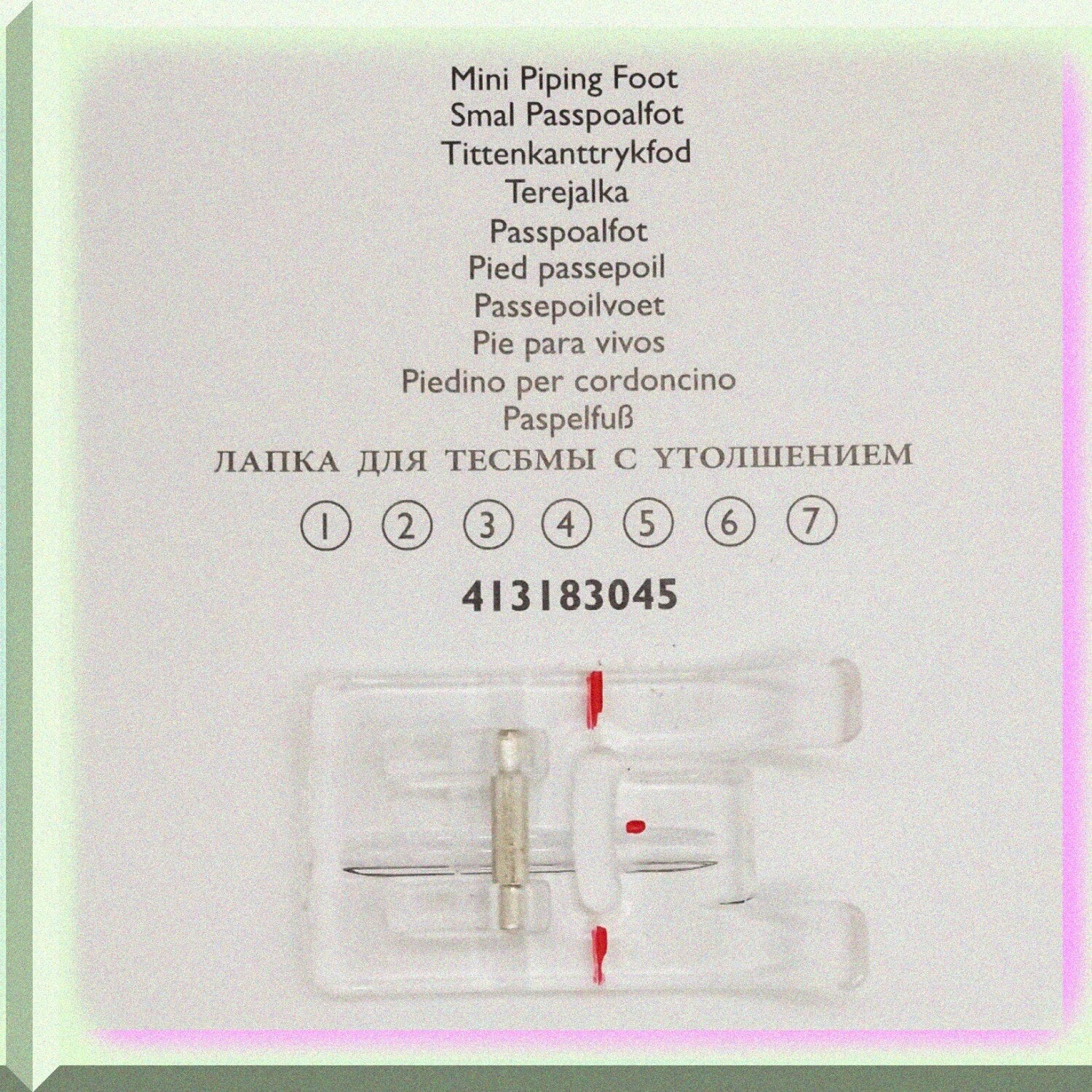 This mini piping foot is designed to insert piping into seams and edges, providing a tailored and professional finish to your sewing projects. It features a precise 1.5mm piping size, making it ideal for adding decorative piping to various fabrics. The foot is compatible with a wide range of sewing machine models, including Group 6, Group 5, Group 4, Group 3, Group 2, and Group 1 models, covering numerous series and individual machines. Its compact design allows for easy maneuvering and accurate piping placement, enhancing the quality of your finished work. Whether you're working on quilting, garment construction, or decorative accents, this piping foot offers versatility and precision. The package includes the necessary insert for seamless piping application, ensuring a clean and professional look in every project.
