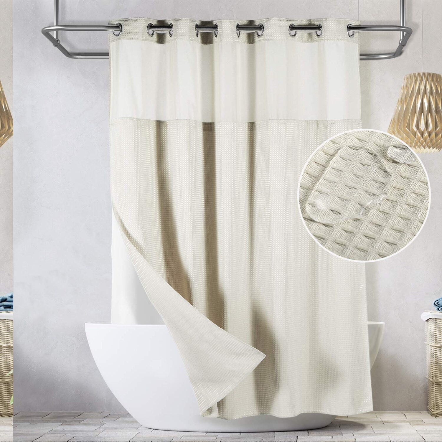 Enhance your bathroom with this durable shower curtain featuring a waffle weave fabric and a see-through top for added privacy and airflow. The quick and easy installation requires no rings or hooks—simply snap it onto your shower rod in seconds. Its humanized design includes a sheer window that maintains ventilation while preserving privacy. The waterproof, removable liner attaches easily with snap-in features, allowing for effortless cleaning and moisture protection. To extend its lifespan, keep the curtain out of the tub after use, fully unfold it, detach the liner for laundering, and use only oxygen bleach if needed. Tumble dry or iron on the lowest setting to maintain quality. Crafted for convenience and durability, this heavy-duty bath curtain measures 71 inches wide by 78 inches long and is machine washable. It combines functionality with a sleek cream color, making it a practical addition to any bathroom.