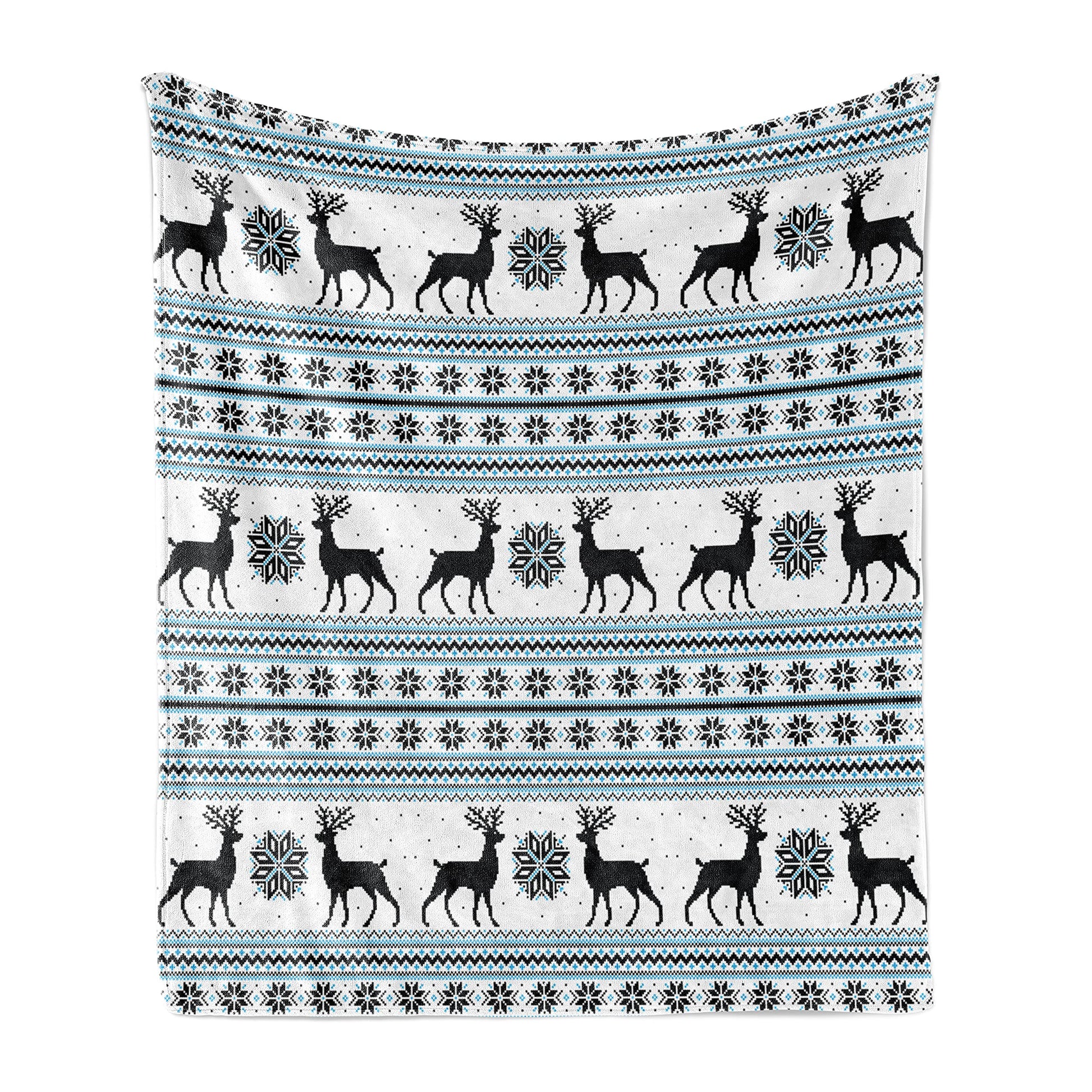 Nordic Throw Blanket, Chevron Zigzags Winter Floral Arrangement Norwegian Reindeer Snow Pattern, Flannel Fleece Accent Piece Soft Couch Cover for Adults, 60" x 80", Black White Sky Blue