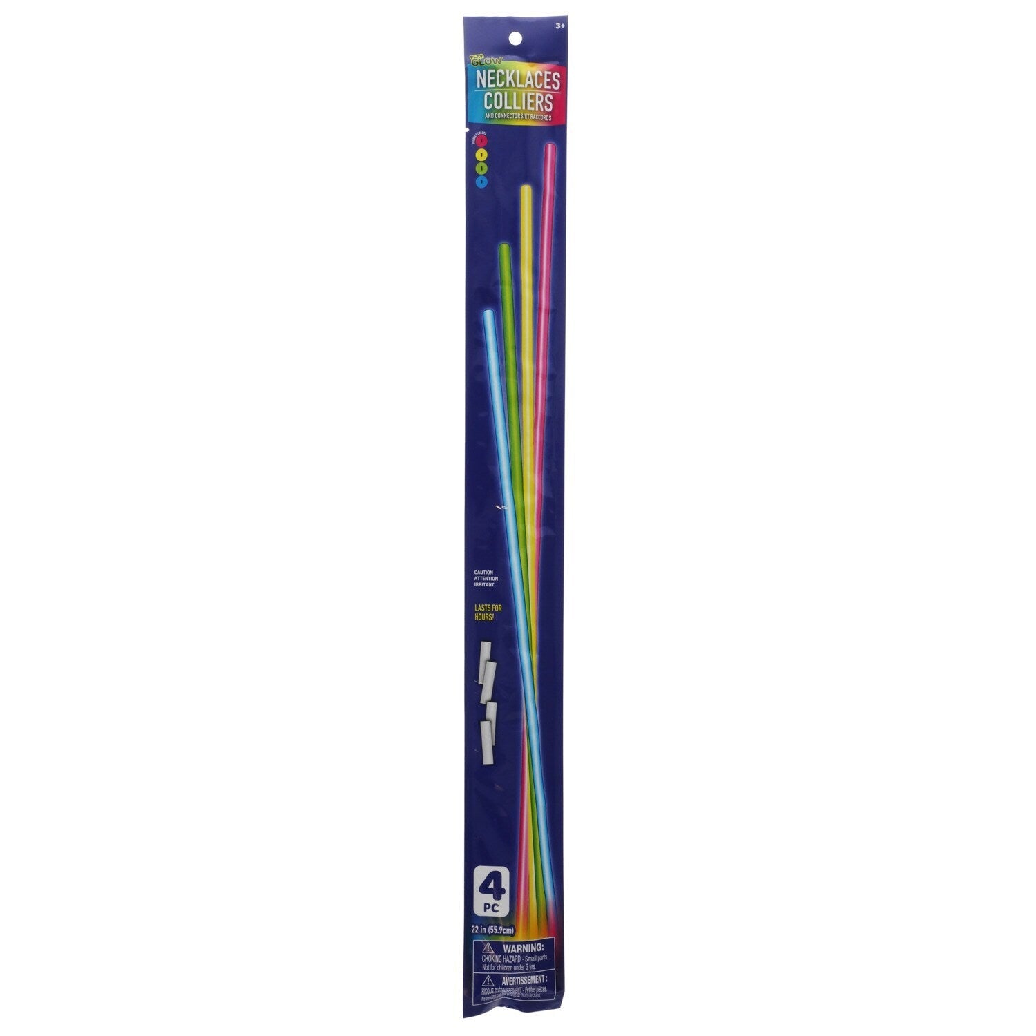 Comes with (Pack of 36). Let your fun and playful spirit SHINE with these Novelty Glow Stick Necklaces! Glow sticks are a staple for many events and get-togethers; where there's a concert, party, backyard barbecue, birthday party, evening picnic, family reunion, or camp activity, glow sticks are never far away. These necklaces are made of glow sticks that measure 22-in. long and come with connectors to help you snap them into place. Each pack includes four colors: blue, green, yellow, and red. You can even think outside the box with these necklaces and use them as rings and hoops for creative party games. Kids and adults alike can't resist the shining power of glow sticks, so make Novelty Glow Stick Necklaces a feature of your next event!