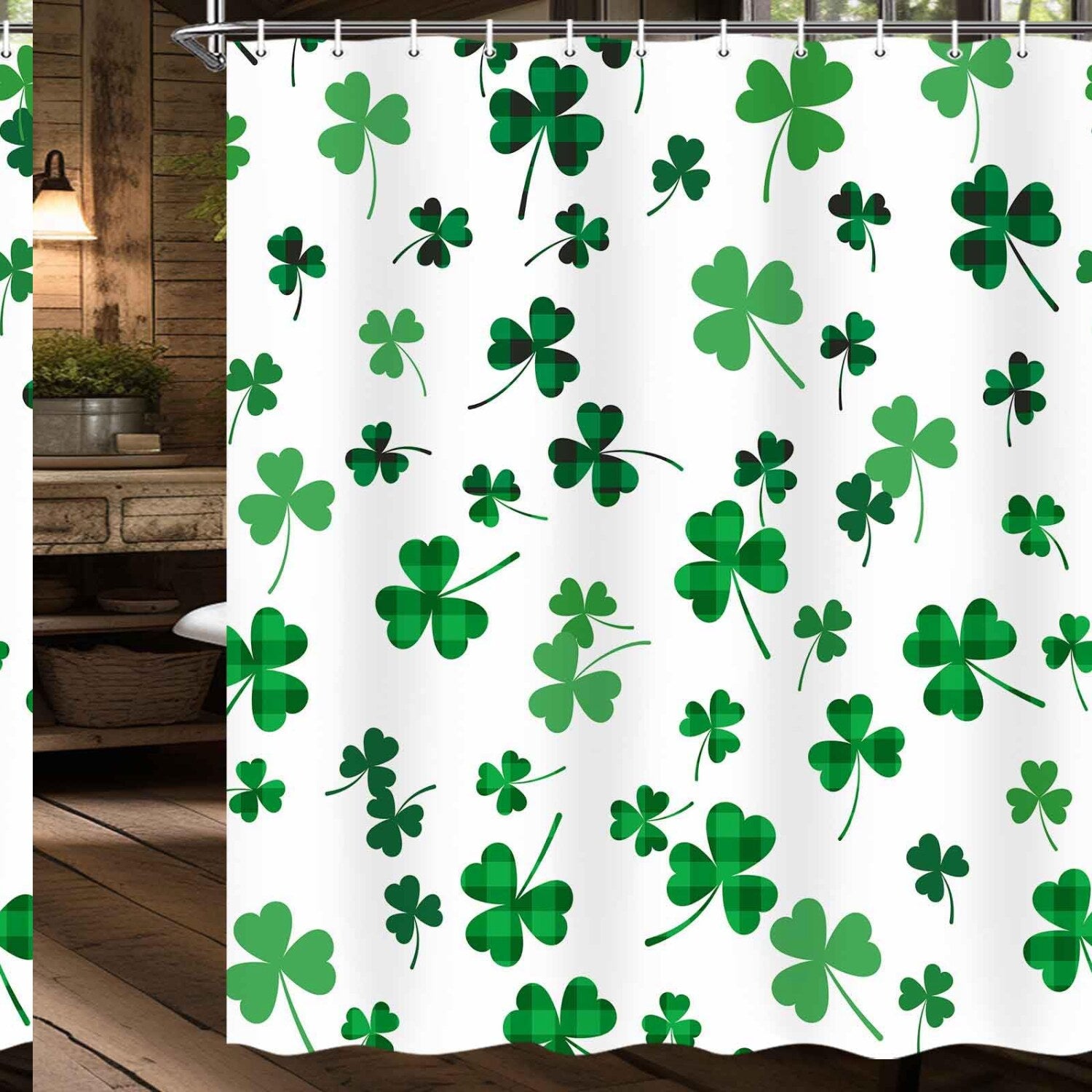 This St. Patrick's Day shower curtain features a green clover leaf Irish shamrock design on easy-care polyester fabric. Measuring 71 x 71 inches, it is suitable for standard bathtubs, shower stalls, or any bathroom. The curtain helps prevent water from splashing out, ensuring a dry and comfortable bathing area. It includes 12 C-shaped hooks for easy installation and a secure fit. The soft, environmentally friendly fabric offers a gentle touch and a pleasant feel. The vibrant shamrock pattern adds a festive touch to your bathroom decor, creating a cheerful and inviting atmosphere. Its durable material and classic design make it a practical and decorative addition to your bathroom space. Perfect for celebrating St. Patrick's Day or adding a touch of Irish charm year-round, this shower curtain combines functionality with a lively, decorative look.