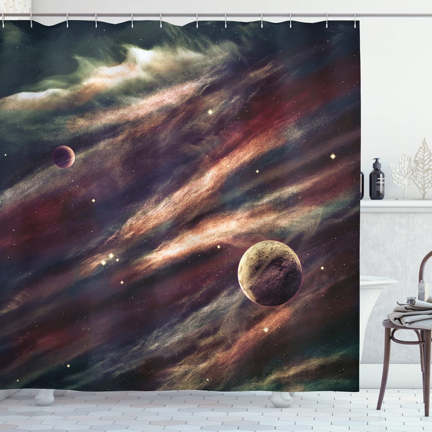 Outer Space Shower Curtain, Planets Over Nebula Gas Cloud Space axy Star Illustration, Cloth Fabric Bathroom Decor Set with Hooks, 69" W x 84" L, Rose Ivory