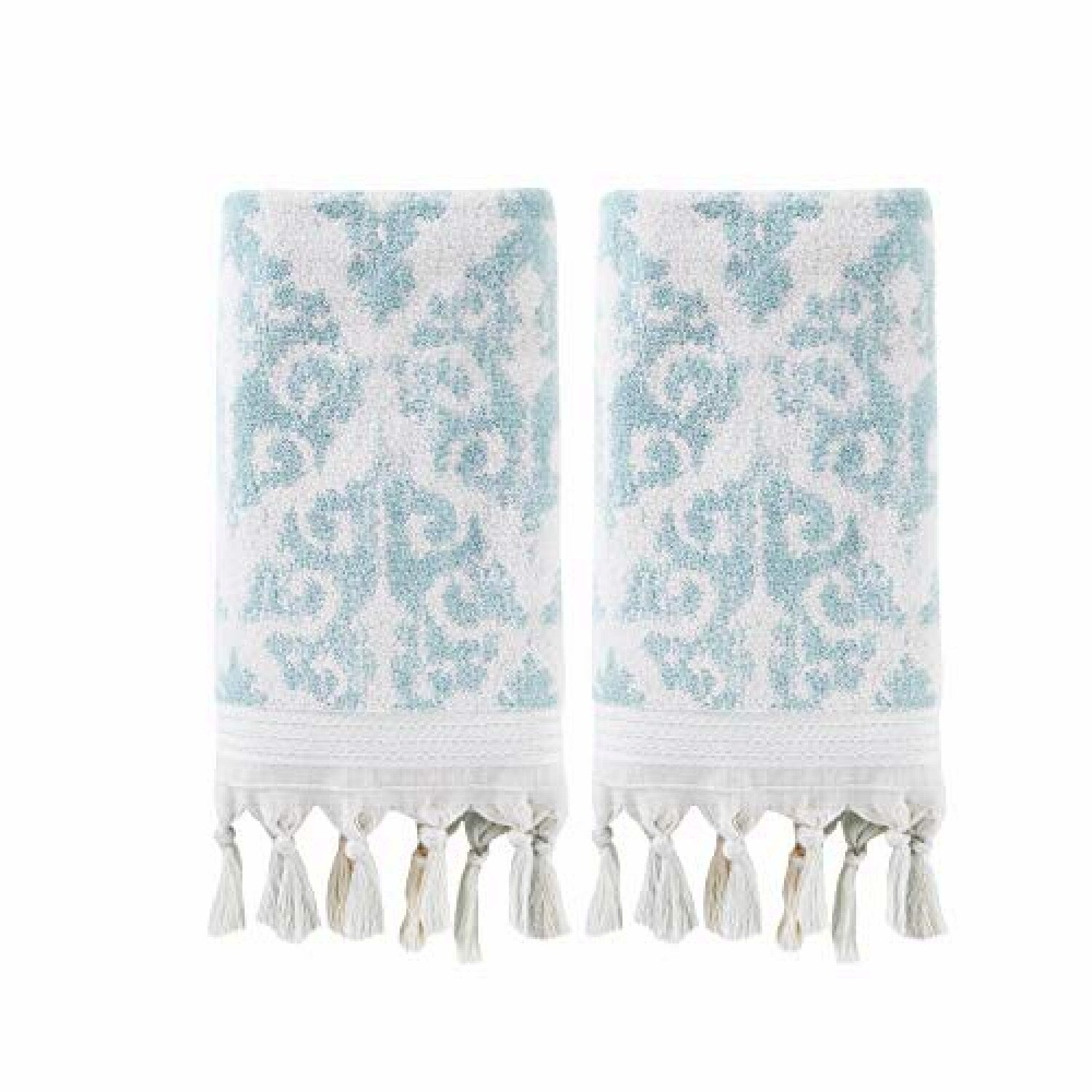 The Mirage Fringe 100% Turkish Cotton Hand Towel Set in Aqua features a reversible, yarn-dyed design with a woven jacquard medallion pattern. Each towel is accented with a striped end hem and hand-knotted fringe, adding a touch of elegance. Made from premium Turkish cotton, known for its long fibers, these towels are stronger, smoother, and become softer with use. Lightweight yet durable, they offer excellent absorbency for everyday use. The set includes two two-toned hand towels measuring 16" x 26", perfect for adding a luxurious feel to your bathroom. Their stylish design makes them suitable for both guest and personal use, bringing personality and flair to your space. The Mirage Fringe towels combine quality craftsmanship with timeless style, making them a versatile addition to any bathroom decor.