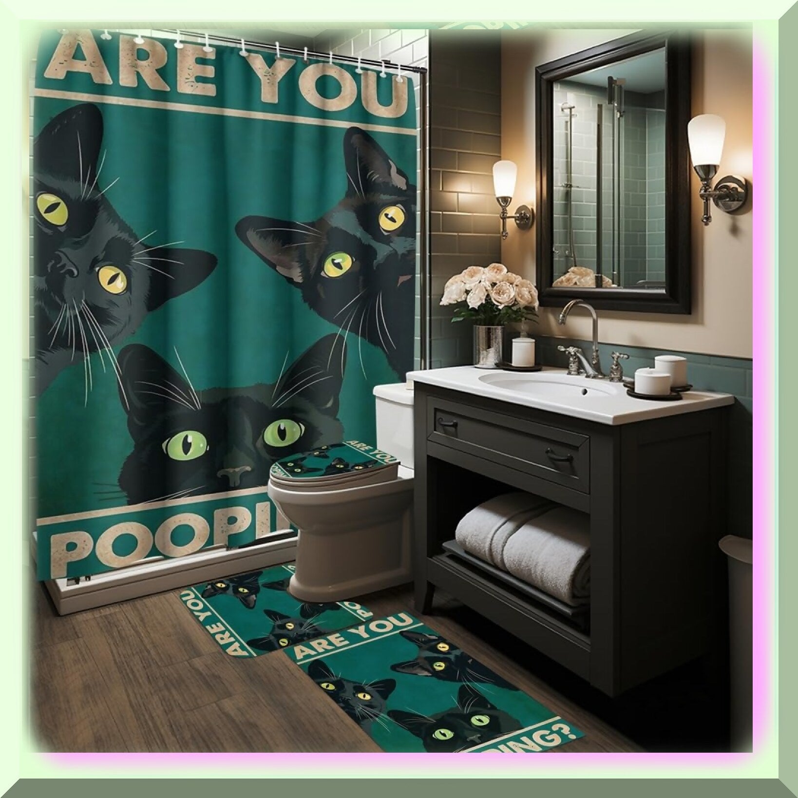 This 4-piece black cat shower curtain set includes a humorous animal-themed design, featuring a highland cow reading a newspaper. The set comprises a waterproof shower curtain, a bath mat, a lid cover, and a pooping bath mat, all decorated with vibrant animal prints. The shower curtain measures 72 inches by 72 inches, providing ample coverage for your bathroom. The bath mat and other accessories are designed to add a playful and decorative touch to your space. The set comes with 12 hooks for easy installation. Perfect for creating a fun, lively atmosphere, this bathroom decor set is suitable for any bathroom needing a cheerful update. It offers both functionality and style, making it a great gift idea for loved ones. Transform your bathroom into a cozy, amusing retreat with this animal print bathroom accessory set.