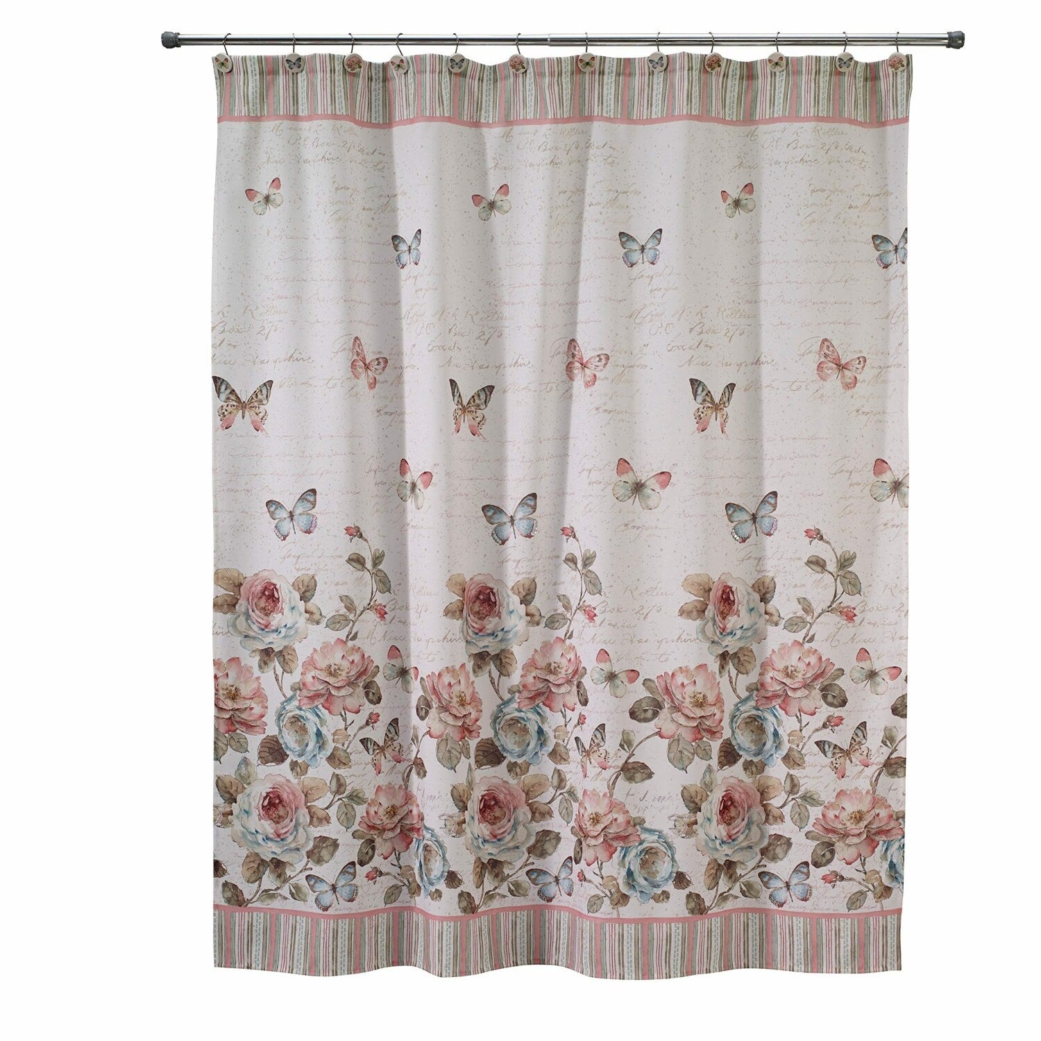 This fabric shower curtain features a charming butterfly-inspired design with a beautifully printed rose and butterfly motif. The pattern is complemented by a coordinating striped border that frames the top and bottom of the curtain, adding a touch of elegance to your bathroom decor. Made from 100% polyester, this shower curtain offers durability and easy maintenance, making it a practical addition to your bathroom. It includes one shower curtain, providing a simple way to enhance your space with a nature-inspired theme. The butterfly garden collection brings a delicate and colorful touch to your bathroom, creating a fresh and inviting atmosphere. Perfect for adding a decorative element while maintaining functionality, this curtain combines attractive design with practical quality. Whether updating your existing decor or creating a new look, this butterfly-themed shower curtain offers a beautiful and durable solution for your bathroom.