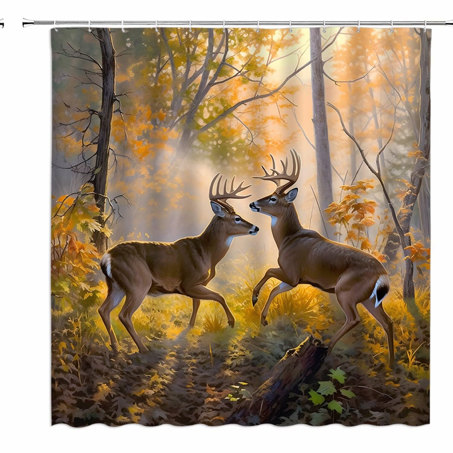 Add rustic charm to your bathroom with this Deer Shower Curtain featuring a wildlife-inspired design of a whitetail elk in a sunset autumn setting. Made from soft-quality fabric, it offers durability and long-lasting use. The water-resistant fabric is easy to clean, ensuring convenience. Equipped with sturdy hooks for quick and secure installation, the curtain stays in place. Its warm yellow color creates a cozy, welcoming atmosphere, while the countryside-inspired design adds a touch of rustic elegance. Measuring 70W x 70H inches, it provides ample coverage for privacy and protection. Perfect for nature lovers or those seeking a charming bathroom update, this curtain combines functionality with aesthetic appeal. Whether for personal use or as a thoughtful gift, it enhances any bathroom decor with its rustic, wildlife motif. Enjoy a blend of practicality and countryside beauty with this charming shower curtain.