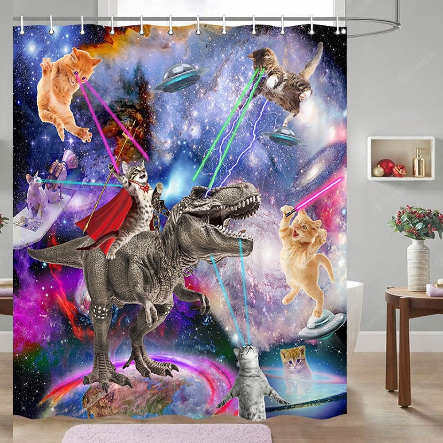 This shower curtain features a humorous design of a cat riding a dinosaur set against a vibrant fantasy galaxy background. Made from durable polyester fabric, it measures 70x70 inches and includes reinforced grommets for easy hanging. The package comes with shower curtain hooks, ensuring a straightforward setup. The curtain's playful outer space universe theme is perfect for kids' bathrooms, adding a fun and whimsical touch to your decor. Custom sizes and patterns are available to suit different needs, with options for small, standard, long, and extra-long curtains. Please note that due to manual measurement, there may be a slight 1-2 cm variation, and color differences may occur because of digital printing and display settings. The reinforced buttonholes ensure compatibility with most standard shower hooks, making installation simple and secure. This curtain combines humor and style, transforming your bathroom into a fun, imaginative space.