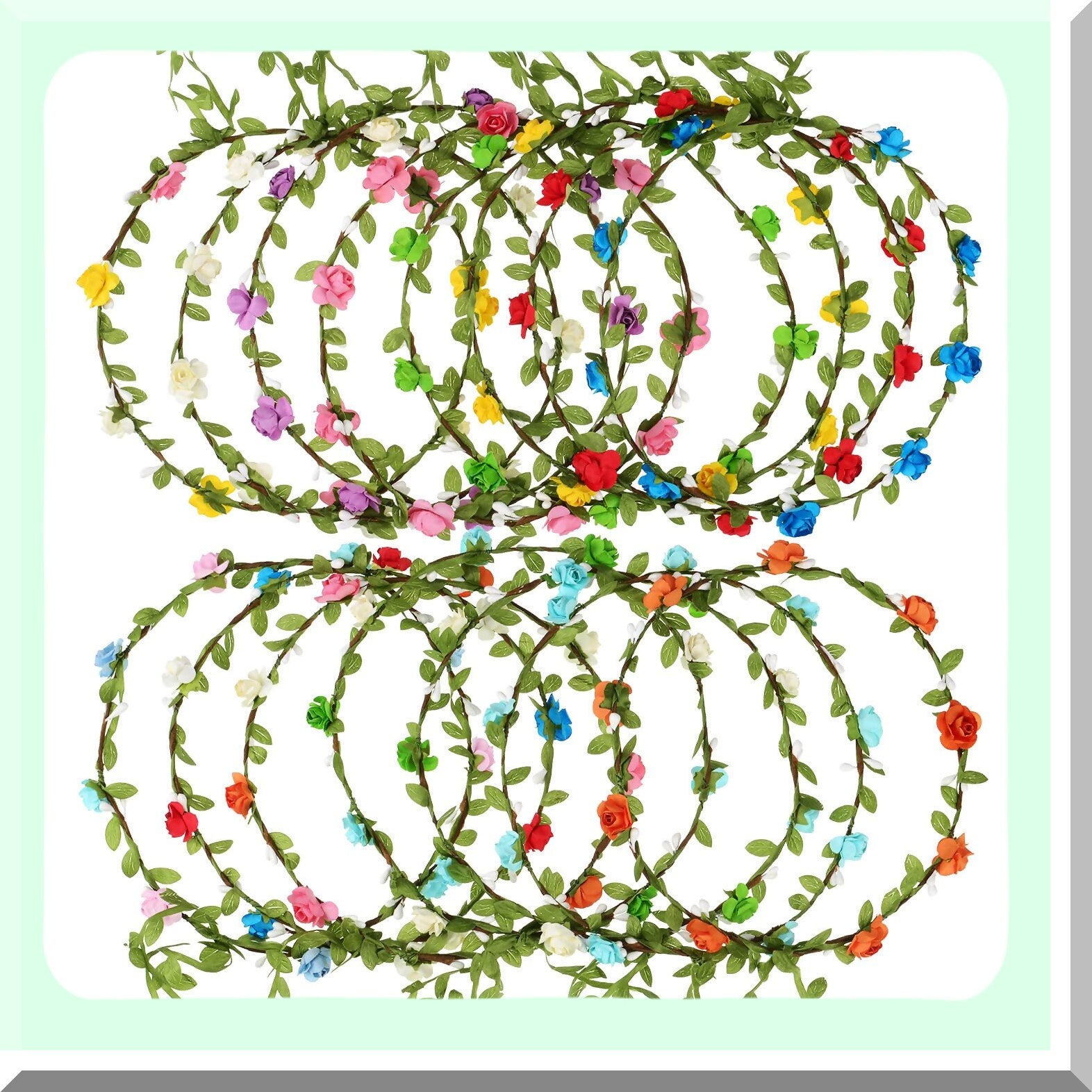 Set of 15 colorful flower crown headbands featuring a variety of monochrome and mixed colors, including ivory, pink, purple, red, blue, mint green, orange, green, rosy, and yellow. Each headband has an approximate diameter of 18 cm (7.1 inches) and is made from paper and fabric materials. Suitable for all ages, from toddlers to middle-aged women, these floral garland headbands add a charming touch to any look. Ideal for a wide range of occasions such as parties, weddings, celebrations, festivals, travel, and special events. The set provides an assortment of vibrant and elegant headbands that can be worn individually or shared with family, friends, and colleagues. Perfect for enhancing outfits and creating memorable moments at various gatherings and festivities.