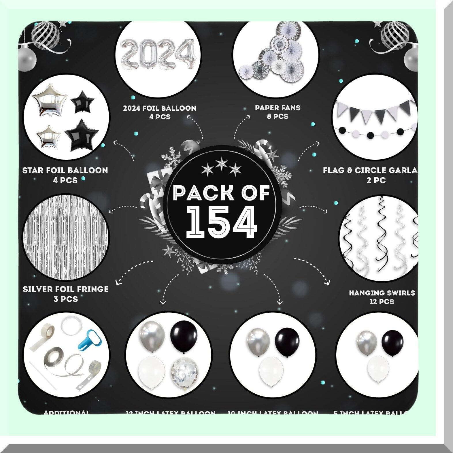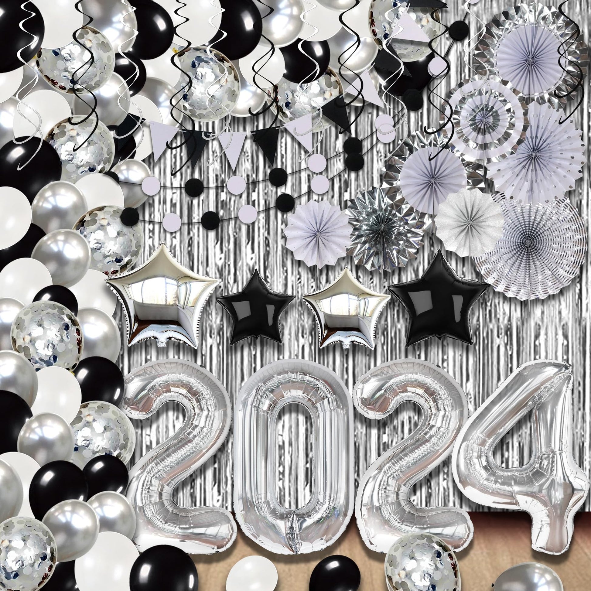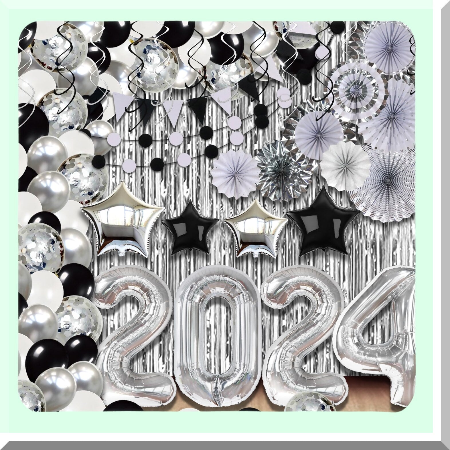 Celebrate in style with a comprehensive set of black and silver decorations for 2024 events. This extensive collection includes a 40-inch balloon arch featuring silver and black balloons, a silver fringe curtain, and a variety of themed accessories such as paper fans, star-shaped balloons, confetti balloons, and decorative swirls. Perfect for marking milestones like graduations or New Yearβs Eve, the set offers reusable, helium-supported decorations that add elegance and excitement to any celebration. The large balloon backdrop and coordinating party supplies create a stunning visual impact, making your event memorable. Designed for versatility, these decorations can be combined with photo props, banners, and other party essentials to enhance your decor. Durable and stylish, this collection ensures a festive atmosphere for any special occasion, providing everything needed to create a sophisticated and joyful environment.