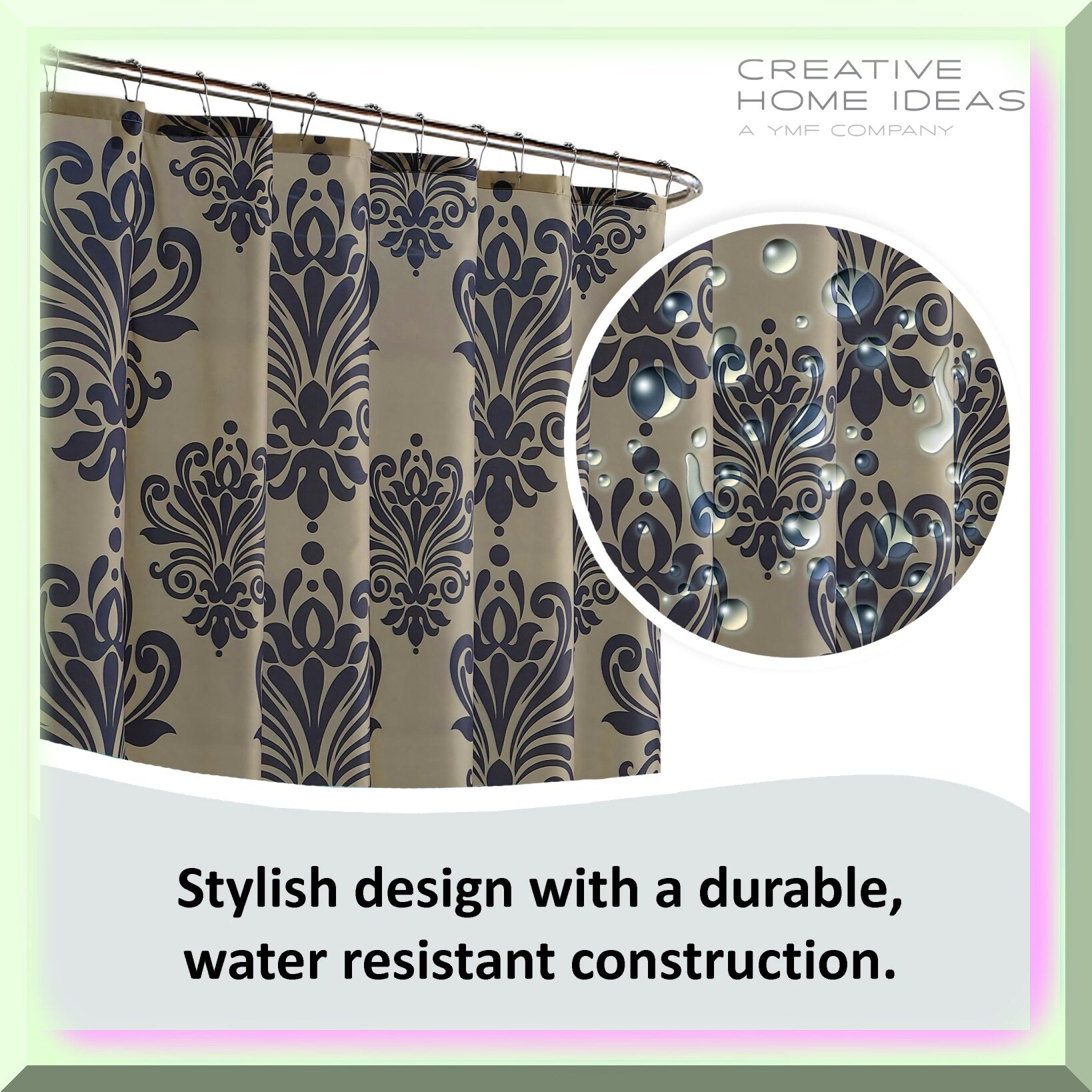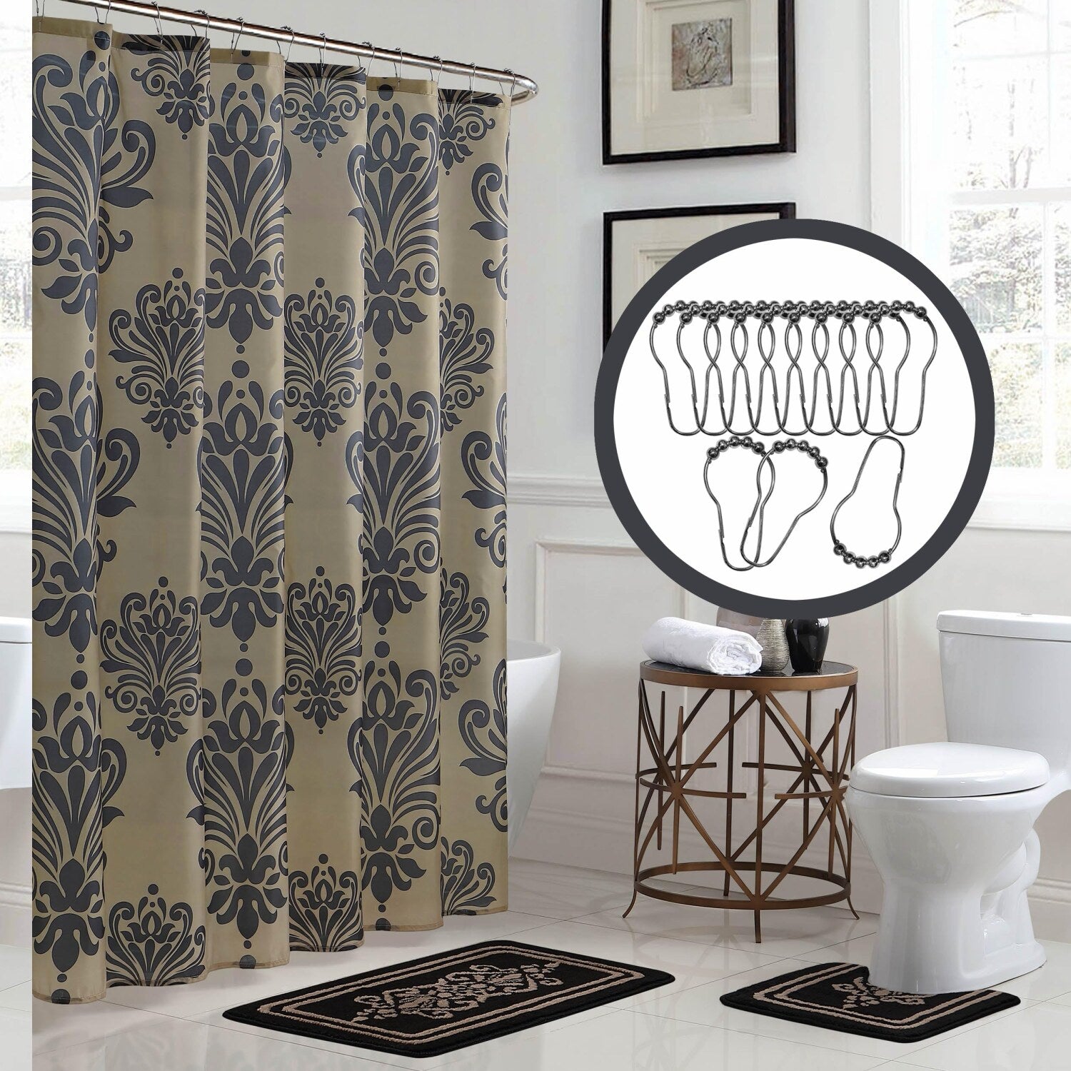 This 15-piece bathroom shower curtain set includes a 72" x 72" shower curtain, 12 metal hooks, an 18" x 30" bath mat, and an 18" x 17" contour mat. The shower curtain is made of 100% polyester, while the bath rugs are crafted from 100% olefin. The bath mats feature a skid-resistant backing and slip-resistant surface for added safety. All items are machine washable for easy maintenance. The set's modern design features a damask pattern in rich, saturated colors, instantly enhancing the look of your bathroom. The metal hooks are designed to fit standard curtain rods, with the curtain liner and rod sold separately. This versatile set offers a stylish and functional upgrade to your bathroom decor, combining elegance with practicality. Imported.